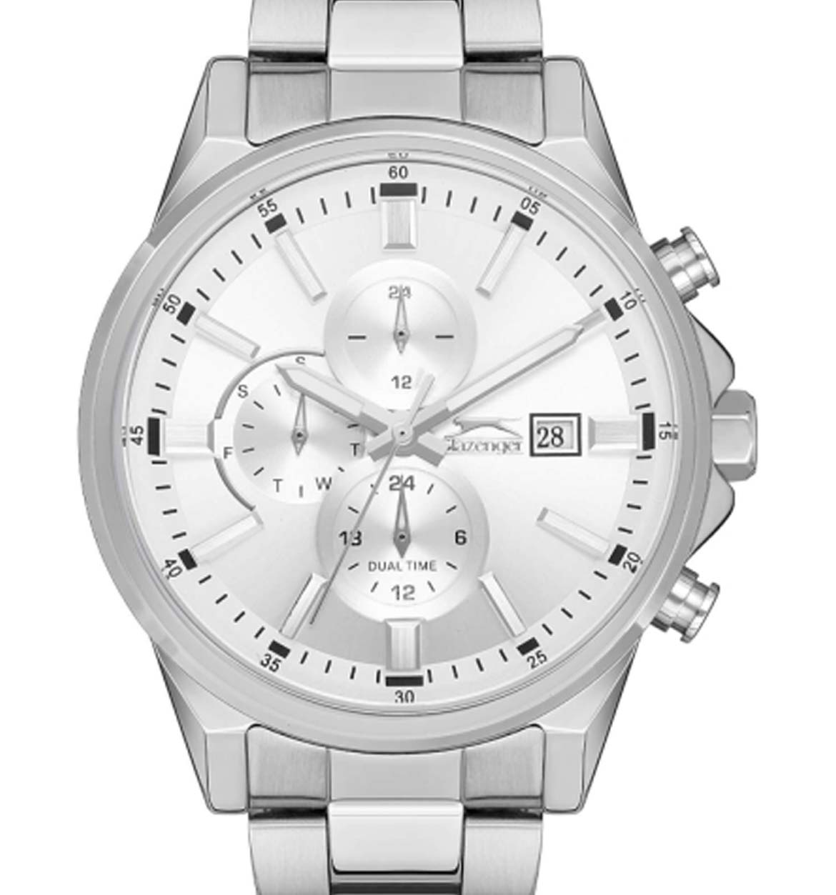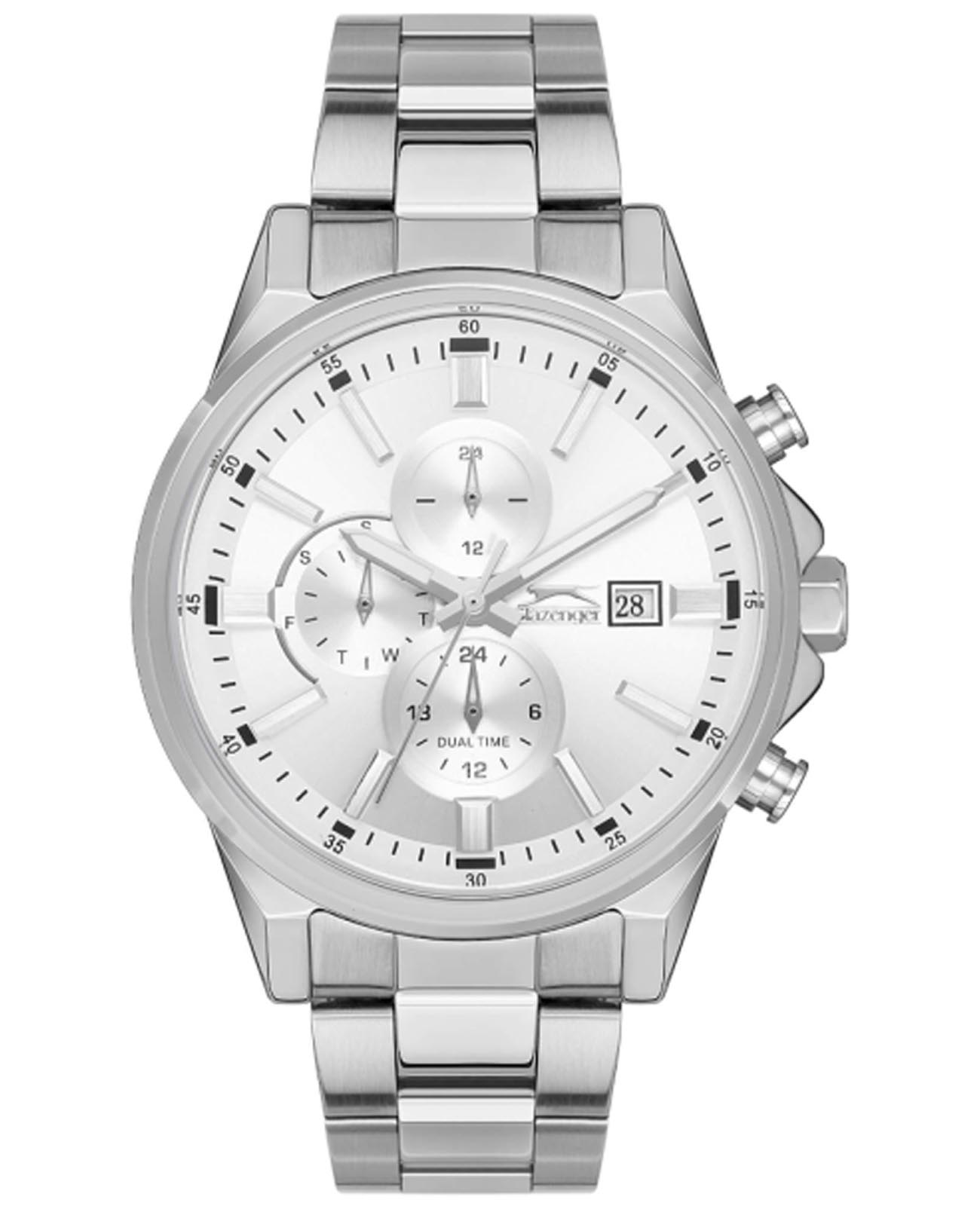 Часы Slazenger SL.09.2139.2.01 воплощают в себе элегантность и практичность, идеально подходящие для современных мужчин. Их серебристый циферблат защищен минеральным стекломМинеральное стеклоМинеральное стекло представляет собой искусственно выращенный минерал кварца. Такое стекло отличается особой устойчивостью к повреждениям и царапинам. Уступает по некоторым качествам сапфировому стеклу. и заключен в серебристый корпус диаметром 46 мм, который изготовлен из прочного суперметалла. Часы оснащены указателями второго часового пояса, дня недели и текущего времени в 24-х часовом формате на дополнительных малых циферблатах. Окошко даты расположено в положении 3 часов. Стрелки и метки имеют люминесцентное покрытиеЛюминесцентное покрытиеПозволяет считывать показания времени в темноте. Производители наносят на стрелки, часовые индексы, безель или поверхность циферблата светонакопительный состав, дающий холодное свечение., что позволяет легко считывать время в темноте. Надежный кварцевый механизм обеспечивает точность, а водозащита 5 ATM делает их устойчивыми к воздействию воды. Браслет из суперметалла имеет раскладную застёжкуРаскладная застёжкаТакой тип застёжки используется только на браслетах из металла. Она никогда не раскрывается полностью, происходит разделение на 2 и более частей. Раскладывающая застёжка снизит вероятность потери часов к минимуму., что подчеркивает современный стиль и позволяет легко снимать часы. Ширина ремешка 22 мм.