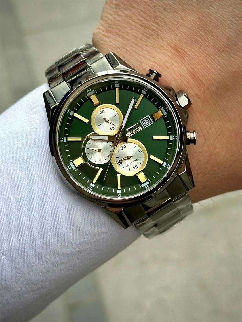 Часы Slazenger SL.09.2139.2.04 воплощают в себе элегантность и практичность, идеально подходящие для современных мужчин. Их зеленый циферблат защищен минеральным стекломМинеральное стеклоМинеральное стекло представляет собой искусственно выращенный минерал кварца. Такое стекло отличается особой устойчивостью к повреждениям и царапинам. Уступает по некоторым качествам сапфировому стеклу. и заключен в серый матовый корпус диаметром 46 мм, который изготовлен из прочного суперметалла с IP-покрытиемIP-покрытиеМетод ионного напыления. Демонстрирует повышенную устойчивость к истиранию, окислению и химическим веществам. Под воздействием высокого давления и температуры около 1500°C молекулы металла надёжно соединяются с частицами корпуса часов.. Часы оснащены указателями второго часового пояса, дня недели и текущего времени в 24-х часовом формате на дополнительных малых циферблатах. Окошко даты расположено в положении 3 часов. Стрелки и метки имеют люминесцентное покрытиеЛюминесцентное покрытиеПозволяет считывать показания времени в темноте. Производители наносят на стрелки, часовые индексы, безель или поверхность циферблата светонакопительный состав, дающий холодное свечение., что позволяет легко считывать время в темноте. Надежный кварцевый механизм обеспечивает точность, а водозащита 5 ATM делает их устойчивыми к воздействию воды. Браслет из суперметалла с IP-покрытиемIP-покрытиеМетод ионного напыления. Демонстрирует повышенную устойчивость к истиранию, окислению и химическим веществам. Под воздействием высокого давления и температуры около 1500°C молекулы металла надёжно соединяются с частицами корпуса часов. имеет раскладную застёжкуРаскладная застёжкаТакой тип застёжки используется только на браслетах из металла. Она никогда не раскрывается полностью, происходит разделение на 2 и более частей. Раскладывающая застёжка снизит вероятность потери часов к минимуму., что подчеркивает современный стиль и позволяет легко снимать часы. Ширина ремешка 22 мм.