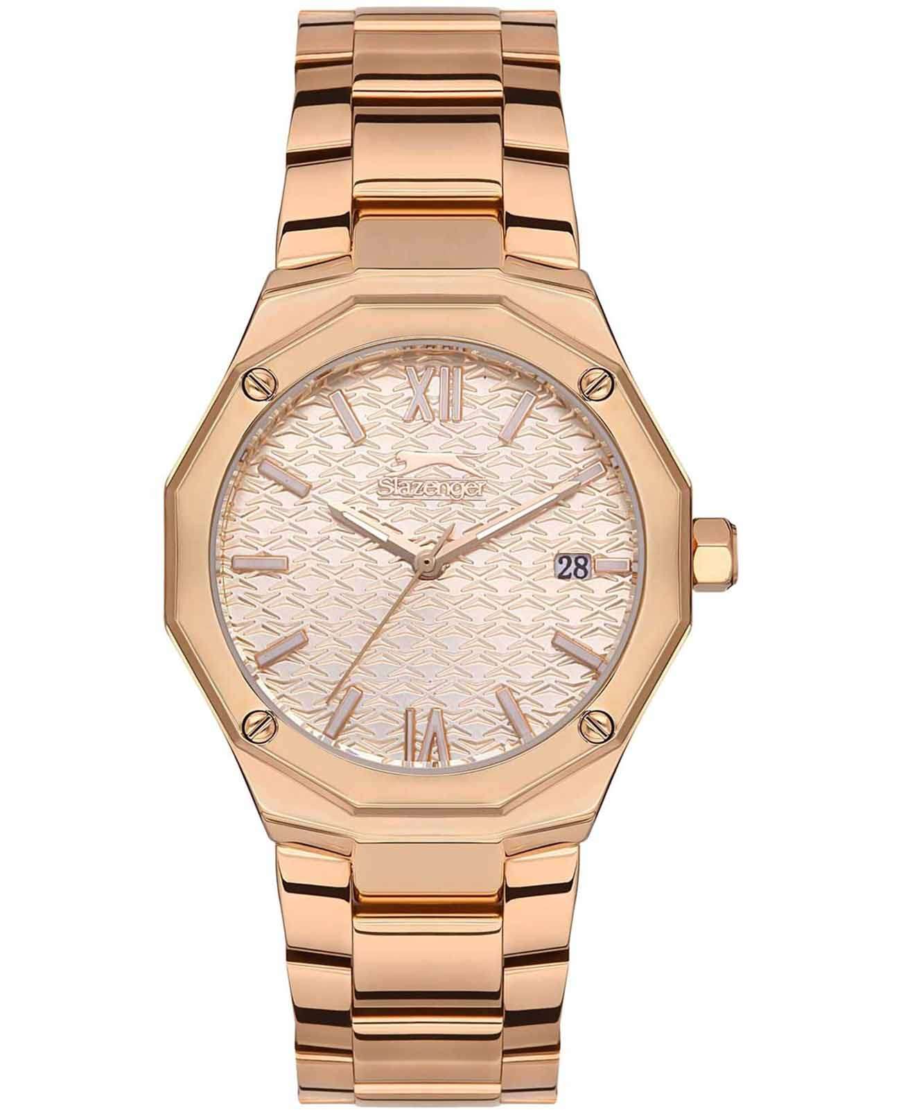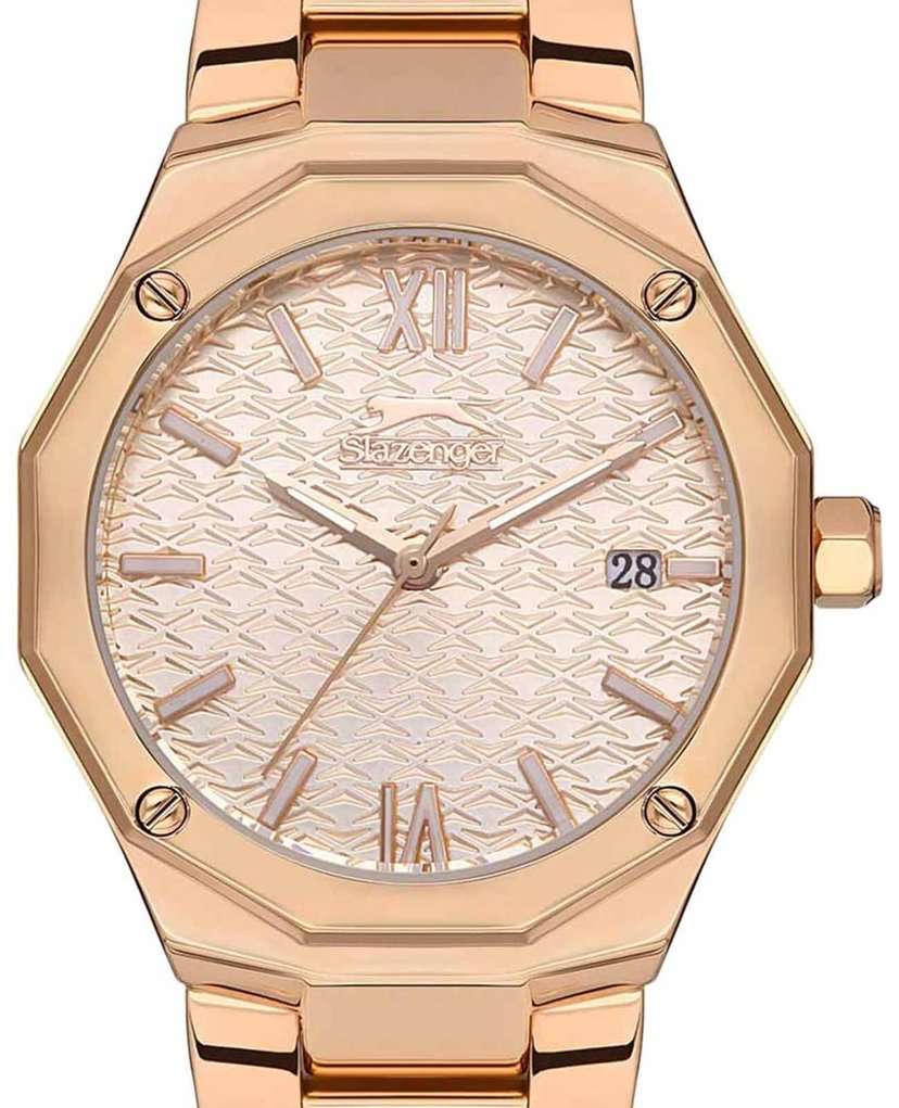Часы Slazenger SL.09.2149.3.04 — это изящное сочетание классического стиля и современных технологий. Эти женские кварцевые часы привлекают внимание своим золотистым циферблатом, который украшен декоративным рисунком и логотипом бренда. Метки в виде штрихов и римских цифр VI и XII придают циферблату элегантность и читаемость. Окошко даты удобно расположено в положении 3 часа, что позволяет легко следить за числом. Корпус диаметром 34 мм выполнен из суперметалла с розово-золотистым IP-покрытиемIP-покрытиеМетод ионного напыления. Демонстрирует повышенную устойчивость к истиранию, окислению и химическим веществам. Под воздействием высокого давления и температуры около 1500°C молекулы металла надёжно соединяются с частицами корпуса часов., который отличается повышенной прочностью. Толщина корпуса составляет 10 мм, что делает часы утонченными и удобными для повседневного ношения. Двенадцатигранный безельБезельВнешний ободок, закрепляющий стекло. В спортивных часах так называется поворотное кольцо с делениями на циферблате, выполняет роль таймера – замеряет отрезки времени на шкале. Неподвижный безель – элемент декора. Однонаправленно вращающийся безель на дайверских часах позволяет фиксировать моменты погружения и выныривания на поверхность. прикреплен на 4 винтах. Люминесцентное покрытиеЛюминесцентное покрытиеПозволяет считывать показания времени в темноте. Производители наносят на стрелки, часовые индексы, безель или поверхность циферблата светонакопительный состав, дающий холодное свечение. на стрелках обеспечивает отличную видимость в темноте. Металлический браслет с розово-золотистым IP-покрытиемIP-покрытиеМетод ионного напыления. Демонстрирует повышенную устойчивость к истиранию, окислению и химическим веществам. Под воздействием высокого давления и температуры около 1500°C молекулы металла надёжно соединяются с частицами корпуса часов. и раскладной застёжкойРаскладная застёжкаТакой тип застёжки используется только на браслетах из металла. Она никогда не раскрывается полностью, происходит разделение на 2 и более частей. Раскладывающая застёжка снизит вероятность потери часов к минимуму., что обеспечивает надежную фиксацию на запястье и комфорт при носке. Минеральное стеклоМинеральное стеклоМинеральное стекло представляет собой искусственно выращенный минерал кварца. Такое стекло отличается особой устойчивостью к повреждениям и царапинам. Уступает по некоторым качествам сапфировому стеклу. надежно защищает циферблат от царапин и других повреждений, а водозащита на уровне 30WR позволяет не беспокоиться о случайных брызгах воды. Шестигранная заводная головка добавляет оригинальности и удобства в управлении настройками. Эти часы станут прекрасным аксессуаром для женщин, ценящих классический дизайн, качество и надежность, которые не подвластны скоротечным модным тенденциям.