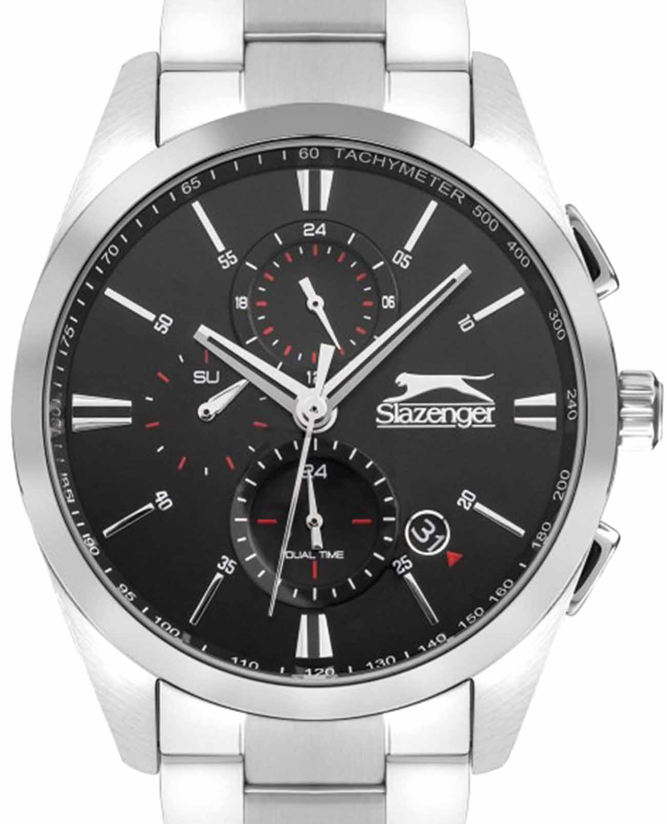 Часы Slazenger SL.09.2215.2.02 представляют собой стильные мужские наручные часы, которые сочетают в себе элегантный дизайн и функциональность. Изготовленные в Англии, эти кварцевые часы оснащены прочным металлическим корпусом и металлическим браслетом с раскладной застёжкойРаскладная застёжкаТакой тип застёжки используется только на браслетах из металла. Она никогда не раскрывается полностью, происходит разделение на 2 и более частей. Раскладывающая застёжка снизит вероятность потери часов к минимуму., который обеспечивает надежную фиксацию на запястье. Минеральное стеклоМинеральное стеклоМинеральное стекло представляет собой искусственно выращенный минерал кварца. Такое стекло отличается особой устойчивостью к повреждениям и царапинам. Уступает по некоторым качествам сапфировому стеклу. защищает черный циферблат от царапин, а водозащита WR 50 позволяет использовать их в условиях повышенной влажности. Диаметр корпуса составляет 43 мм, а толщина — 14 мм, что делает часы удобными для ежедневного ношения. Ширина ремешка — 22 мм, что обеспечивает комфорт и стильный вид на руке. Дополнительные функции включают отображение второго часового поясаВторой часовой поясФункция, позволяющая отображать время двух часовых поясов одновременно., дня недели и текущего времени в 24-часовом формате, а также наличие окошка даты для удобства пользователя. Стрелки снабжены люминесцентным покрытиемЛюминесцентное покрытиеПозволяет считывать показания времени в темноте. Производители наносят на стрелки, часовые индексы, безель или поверхность циферблата светонакопительный состав, дающий холодное свечение., что позволяет легко считывать время в темноте. Часы также оснащены тахиметромТахиметрРазмеченная шкала, располагается на ободке или безеле часов. Тахиметр позволяет рассчитать скорость на определённом участке пути, расстояние измеряется в километрах или милях., что добавляет им функциональности и может быть полезно для измерения скорости.
