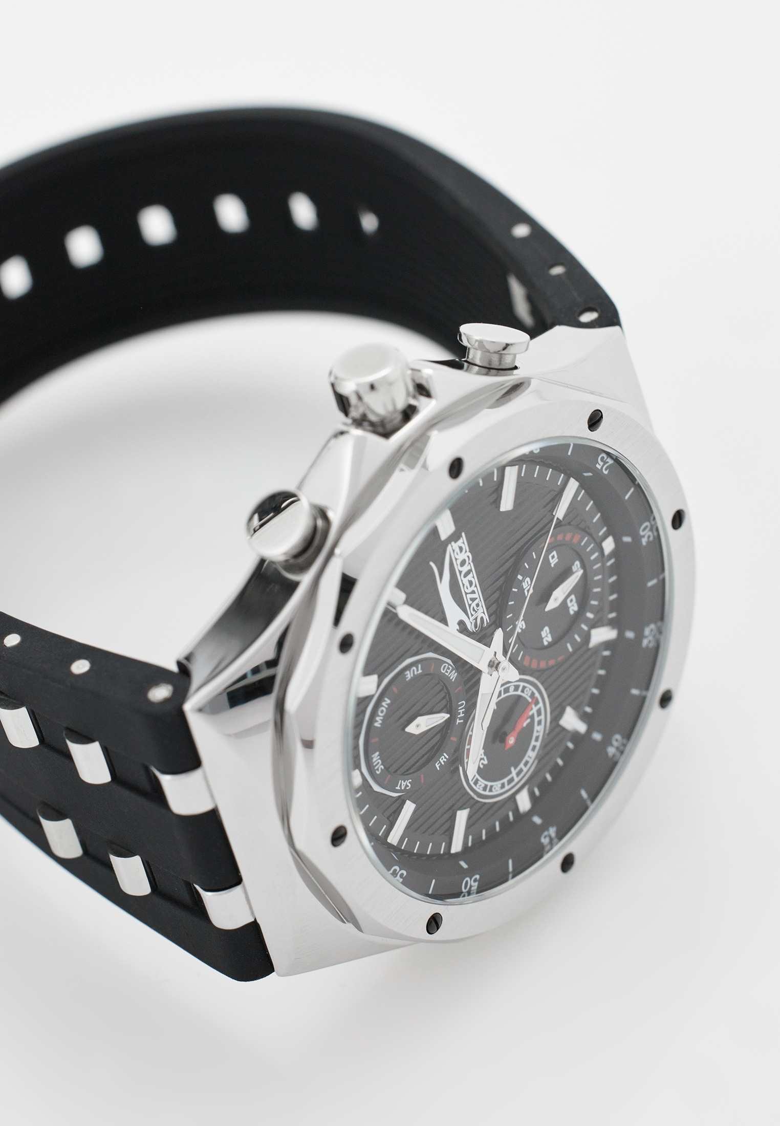 Мужские наручные часы Slazenger SL.09.2218.2.01 — идеальный аксессуар для тех, кто ценит стиль и функциональность. Эти часы, созданные известным британским брендом, отличаются высоким качеством и надежностью. Оснащенные кварцевым механизмом, они гарантируют точность хода и долгий срок службы. Корпус часов выполнен из прочного металла, а черный циферблат защищен минеральным стекломМинеральное стеклоМинеральное стекло представляет собой искусственно выращенный минерал кварца. Такое стекло отличается особой устойчивостью к повреждениям и царапинам. Уступает по некоторым качествам сапфировому стеклу., устойчивым к царапинам и повреждениям. Черный резиновый ремешок с металлическими вставками и классической застежкой обеспечивает комфортное ношение и надежную фиксацию на запястье. Диаметр корпуса составляет 46 мм, а толщина — 12 мм, что придает часам современный и стильный вид. Благодаря водозащите уровня WR 50, вы можете не беспокоиться о случайных попаданиях влаги, что делает эти часы идеальными для повседневного использования. Стрелки снабжены люминесцентным покрытиемЛюминесцентное покрытиеПозволяет считывать показания времени в темноте. Производители наносят на стрелки, часовые индексы, безель или поверхность циферблата светонакопительный состав, дающий холодное свечение., что позволяет легко считывать время в темноте. Функциональность модели включает в себя отображение даты, дня недели и времени в 24-часовом формате на дополнительных малых циферблатах, что делает часы не только стильными, но и практичными.