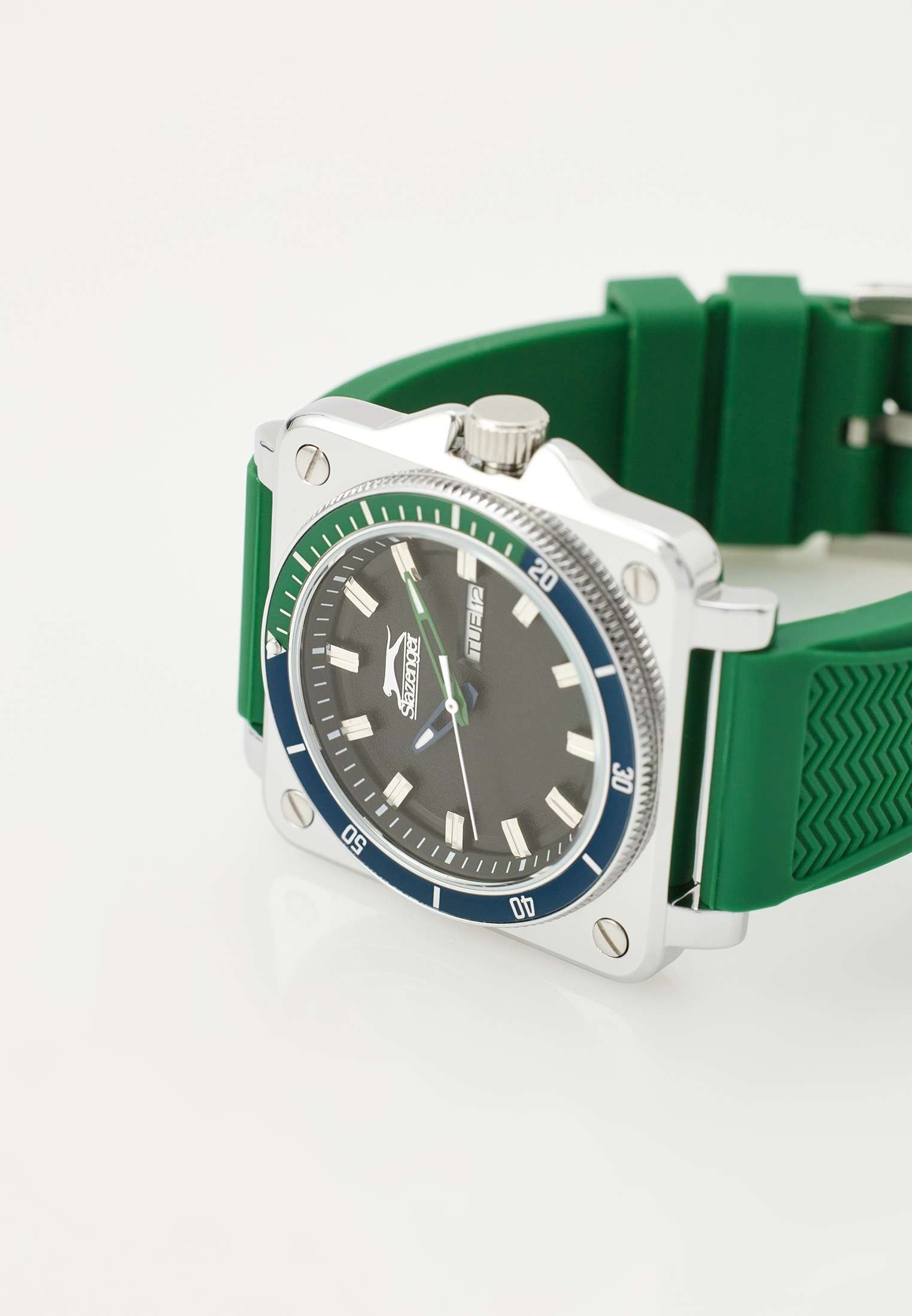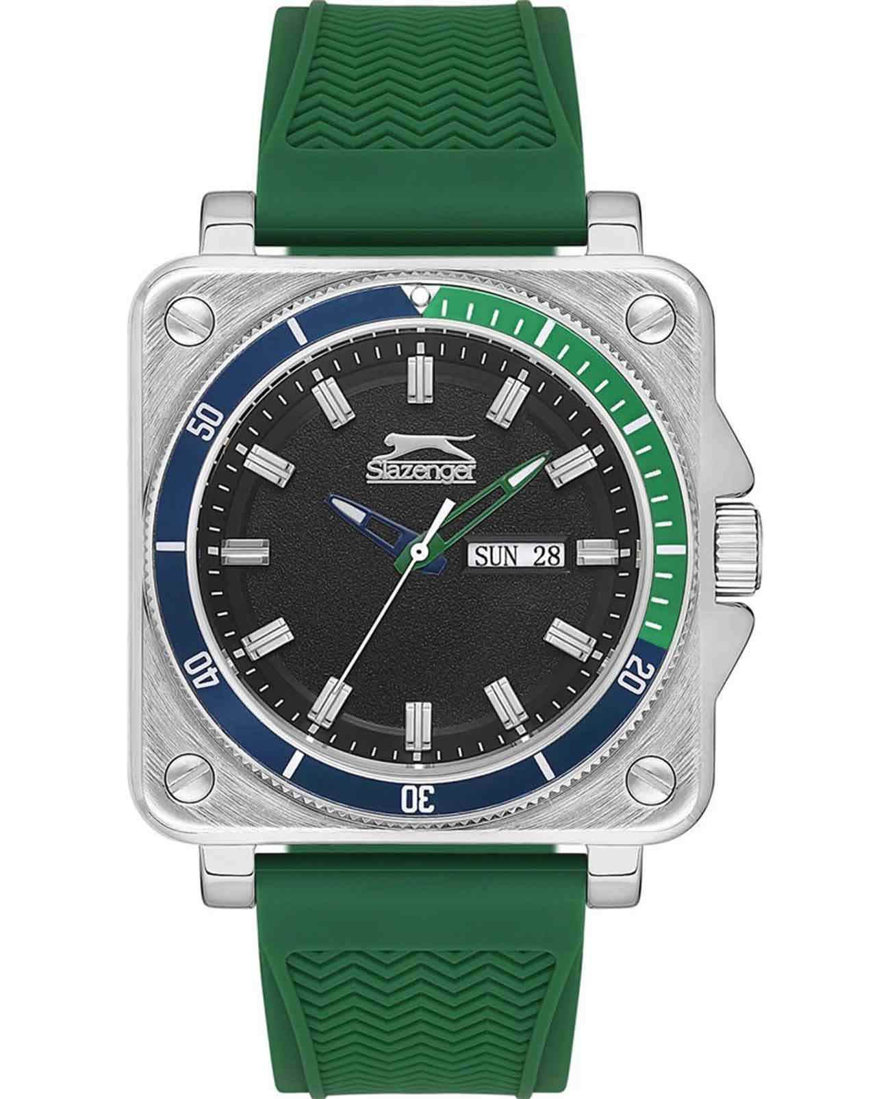 Часы Slazenger SL.09.2233.1.06 — это современная модель, сочетающая стиль и практичность. Корпус квадратной формы выполнен из прочного металла, а круглый черный циферблат придает дизайну особую выразительность. На вращающийся безельБезельВнешний ободок, закрепляющий стекло. В спортивных часах так называется поворотное кольцо с делениями на циферблате, выполняет роль таймера – замеряет отрезки времени на шкале. Неподвижный безель – элемент декора. Однонаправленно вращающийся безель на дайверских часах позволяет фиксировать моменты погружения и выныривания на поверхность. нанесено синее и зеленое IP-покрытиеIP-покрытиеМетод ионного напыления. Демонстрирует повышенную устойчивость к истиранию, окислению и химическим веществам. Под воздействием высокого давления и температуры около 1500°C молекулы металла надёжно соединяются с частицами корпуса часов.. Резиновый зеленый ремешок с классической застежкой обеспечивает удобство при повседневном ношении. Модель оснащена кварцевым механизмом, минеральное стеклоМинеральное стеклоМинеральное стекло представляет собой искусственно выращенный минерал кварца. Такое стекло отличается особой устойчивостью к повреждениям и царапинам. Уступает по некоторым качествам сапфировому стеклу., защищающим от случайных повреждений, и водозащитой уровня WR 50, позволяющей не бояться контакта с водой в повседневных ситуациях. На циферблате расположены окошки даты и дня недели. Для удобства использования в темное время суток предусмотрено люминесцентное покрытиеЛюминесцентное покрытиеПозволяет считывать показания времени в темноте. Производители наносят на стрелки, часовые индексы, безель или поверхность циферблата светонакопительный состав, дающий холодное свечение. стрелок. Заводная головка дополнительно защищена от случайных нажатий. Габариты корпуса составляют 43 на 43 мм, толщина — 11 мм.