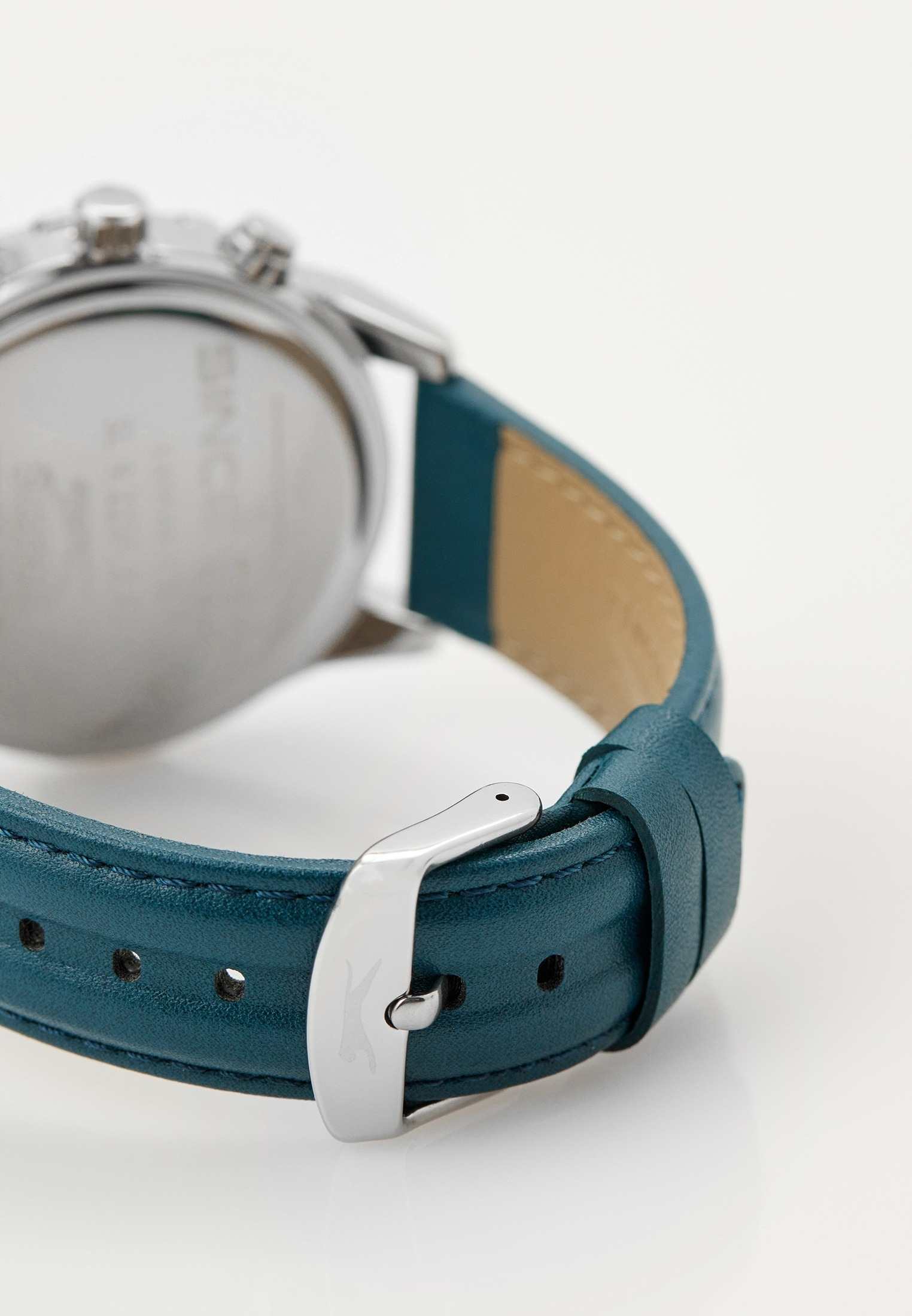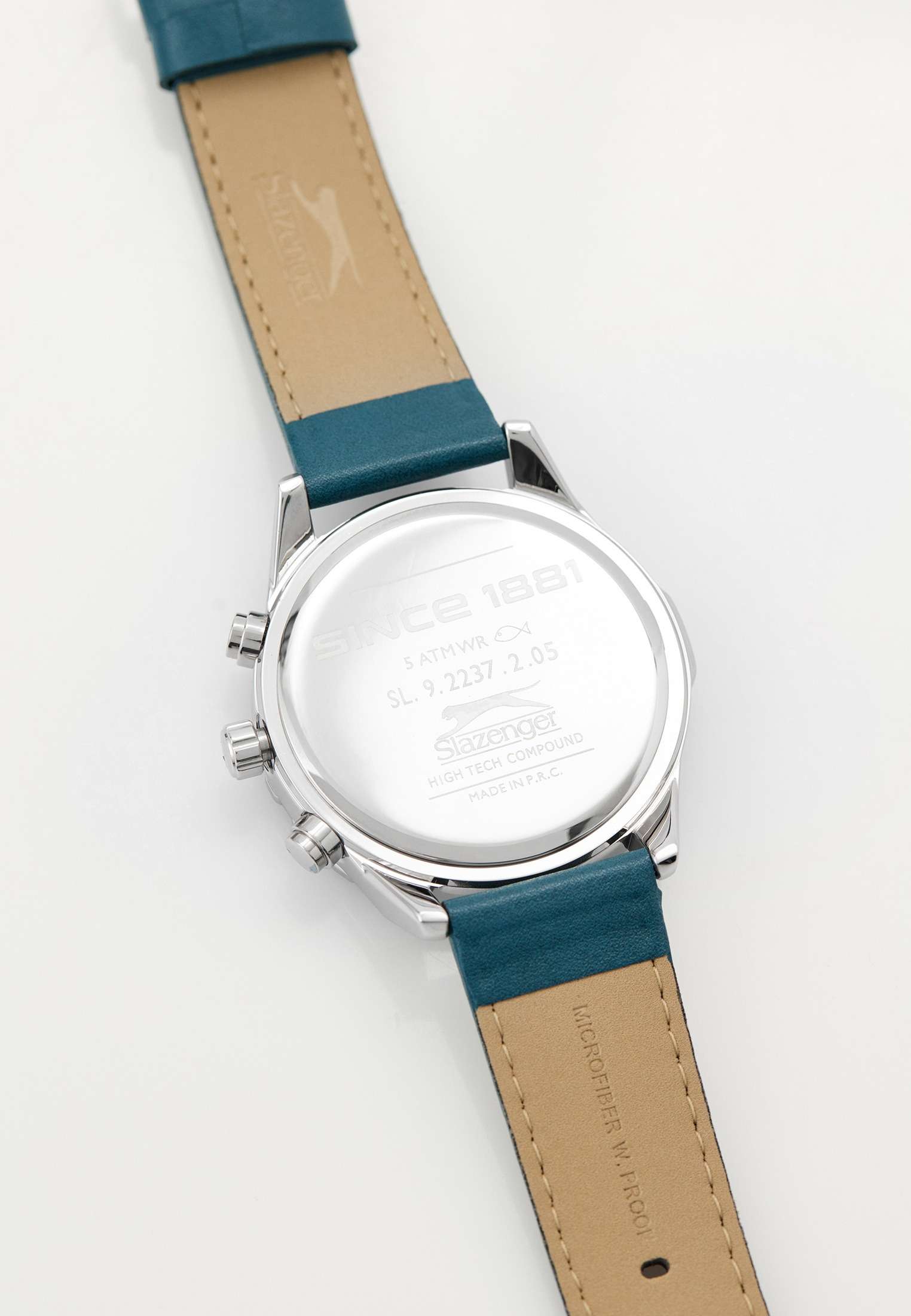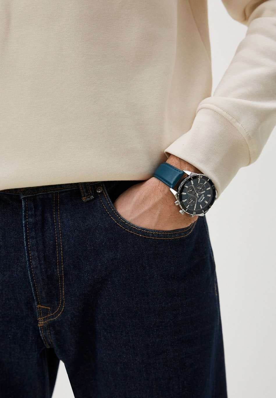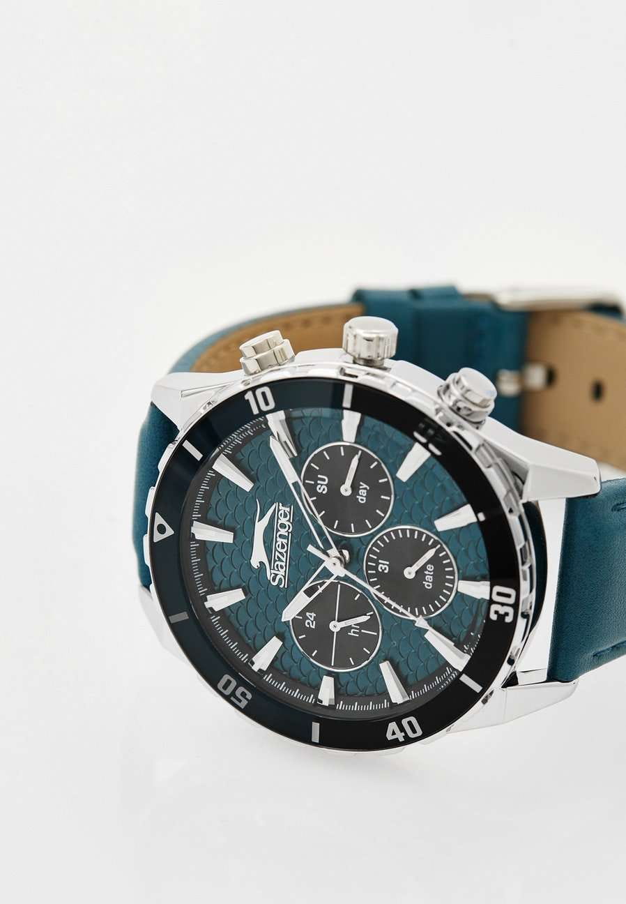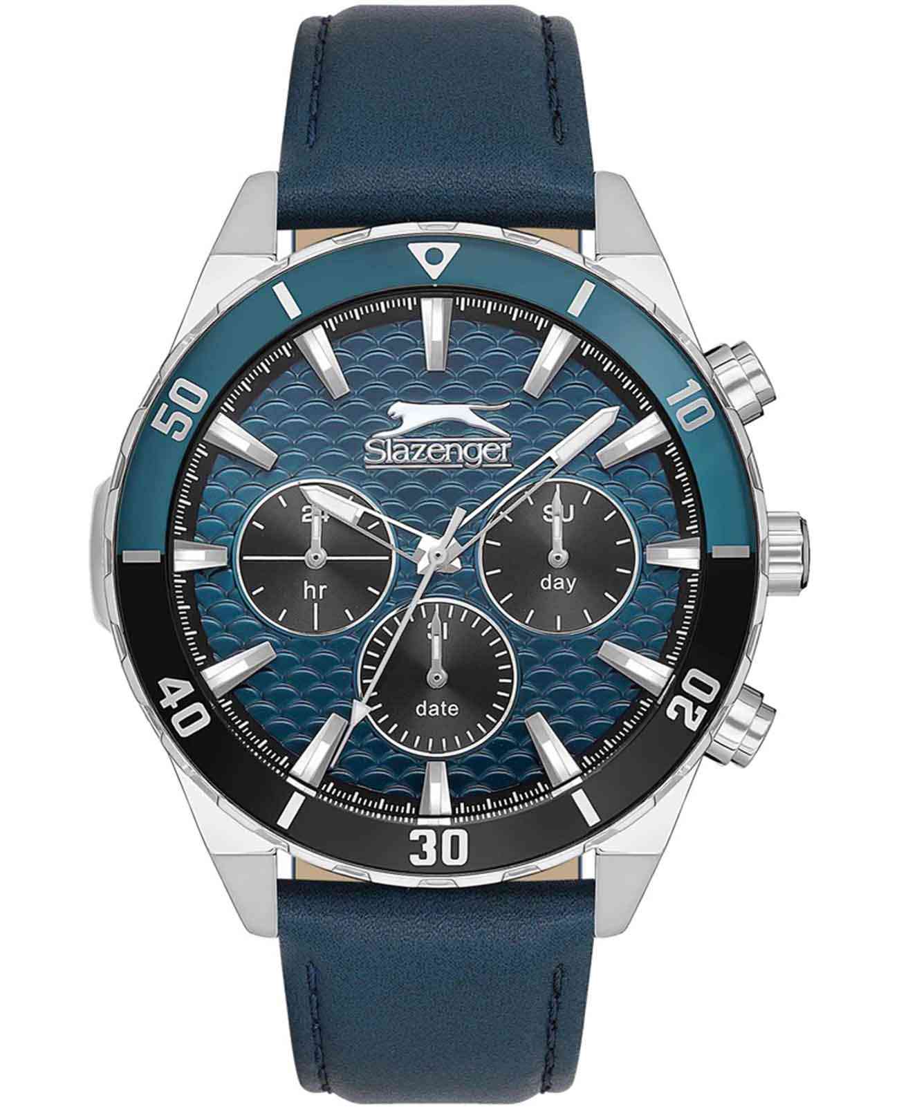 Часы Slazenger SL.09.2237.2.05 — это стильная и надежная модель, которая станет отличным выбором для активного современного мужчины. Крупный корпус диаметром 46 мм выполнен из прочного металла, а синий кожаный ремешок с классической застежкой, что обеспечивает комфорт при повседневном ношении. На безельБезельВнешний ободок, закрепляющий стекло. В спортивных часах так называется поворотное кольцо с делениями на циферблате, выполняет роль таймера – замеряет отрезки времени на шкале. Неподвижный безель – элемент декора. Однонаправленно вращающийся безель на дайверских часах позволяет фиксировать моменты погружения и выныривания на поверхность. нанесено черное и синее IP-покрытиеIP-покрытиеМетод ионного напыления. Демонстрирует повышенную устойчивость к истиранию, окислению и химическим веществам. Под воздействием высокого давления и температуры около 1500°C молекулы металла надёжно соединяются с частицами корпуса часов.. Минеральное стеклоМинеральное стеклоМинеральное стекло представляет собой искусственно выращенный минерал кварца. Такое стекло отличается особой устойчивостью к повреждениям и царапинам. Уступает по некоторым качествам сапфировому стеклу. защищает текстурированный синий циферблат от случайных царапин, а водозащита уровня WR 50 позволяет не переживать о попадании влаги при контакте с водой. На циферблате расположены дополнительные малые циферблаты с отображением даты, дня недели и времени в 24-часовом формате, что делает использование часов максимально функциональным. Для удобства использования в темное время суток предусмотрено люминесцентное покрытиеЛюминесцентное покрытиеПозволяет считывать показания времени в темноте. Производители наносят на стрелки, часовые индексы, безель или поверхность циферблата светонакопительный состав, дающий холодное свечение. стрелок. Толщина корпуса составляет 12 мм, вес часов — 76 грамма.