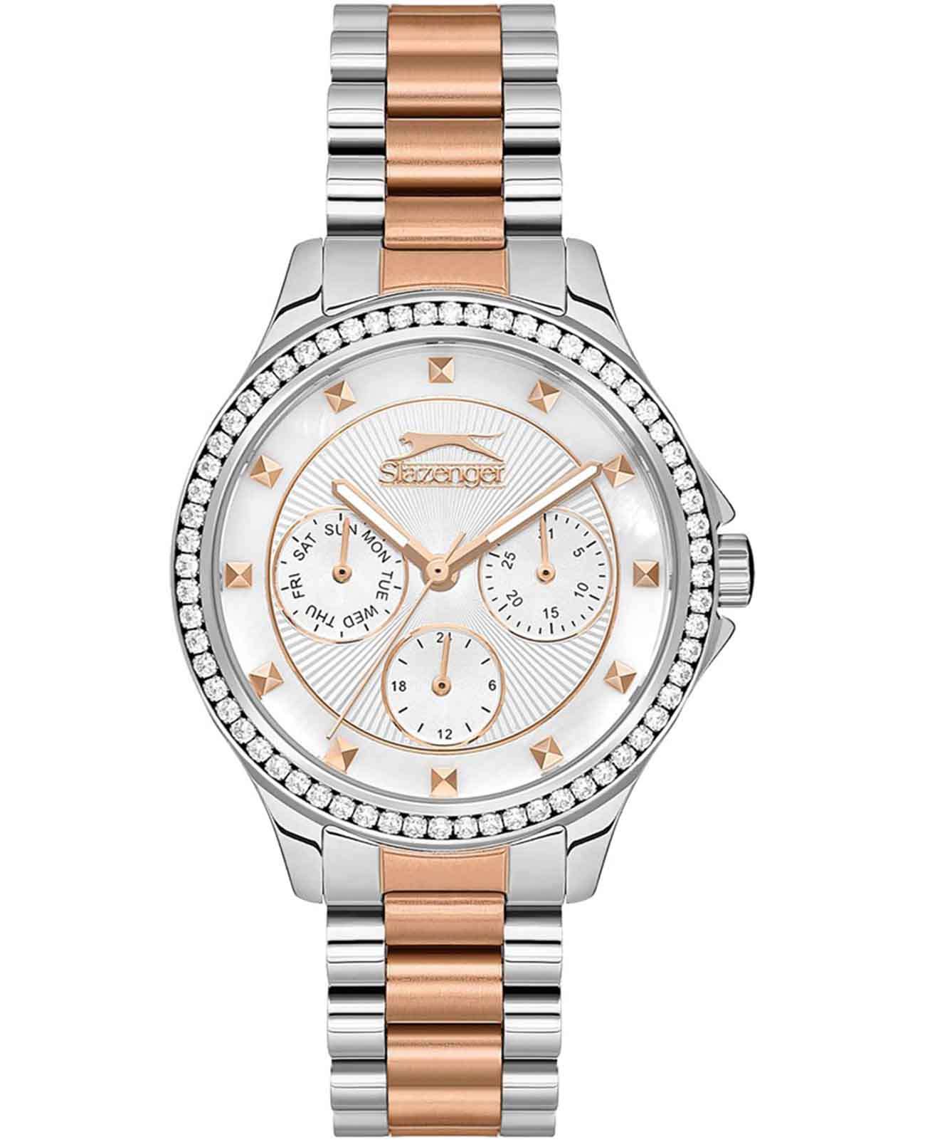 Эти женские часы Slazenger SL.09.2241.4.02 выполнены в современном стиле и станет элегантным дополнением к любому образу. Корпус и браслет изготовлены из прочного металла серебристого цвета, безельБезельВнешний ободок, закрепляющий стекло. В спортивных часах так называется поворотное кольцо с делениями на циферблате, выполняет роль таймера – замеряет отрезки времени на шкале. Неподвижный безель – элемент декора. Однонаправленно вращающийся безель на дайверских часах позволяет фиксировать моменты погружения и выныривания на поверхность. украшен изящными кристаллами, которые придают часам особую привлекательность. На циферблате расположены дополнительные малые циферблаты для отображения даты, дня недели и времени в 24-часовом формате, что делает их функциональными и удобными для ежедневного использования. Минеральное стеклоМинеральное стеклоМинеральное стекло представляет собой искусственно выращенный минерал кварца. Такое стекло отличается особой устойчивостью к повреждениям и царапинам. Уступает по некоторым качествам сапфировому стеклу. надежно защищает циферблат от царапин, а водозащита уровня WR 30 предохраняет механизм от случайных брызг воды. Заводная головка оснащена защитой, а стрелки имеют подсветку для легкого считывания времени в темноте. Диаметр корпуса составляет 34 мм, ширина браслета — 16 мм, толщина корпуса — 9 мм. Часы фиксируются на руке с помощью браслета из металла с частичным розово-золотистым IP-покрытиемIP-покрытиеМетод ионного напыления. Демонстрирует повышенную устойчивость к истиранию, окислению и химическим веществам. Под воздействием высокого давления и температуры около 1500°C молекулы металла надёжно соединяются с частицами корпуса часов. удобной раскладной застёжкиРаскладная застёжкаТакой тип застёжки используется только на браслетах из металла. Она никогда не раскрывается полностью, происходит разделение на 2 и более частей. Раскладывающая застёжка снизит вероятность потери часов к минимуму.. Вес изделия подобран для комфортной ежедневной носки. Для удобства использования в темное время суток предусмотрено люминесцентное покрытиеЛюминесцентное покрытиеПозволяет считывать показания времени в темноте. Производители наносят на стрелки, часовые индексы, безель или поверхность циферблата светонакопительный состав, дающий холодное свечение. стрелок.