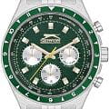 Часы Slazenger SL.09.2248.2.06 — это современная модель с выразительным спортивным характером, идеально подходящая для активного образа жизни. Корпус выполнен из прочного металла, зеленый циферблат защищён минеральным стекломМинеральное стеклоМинеральное стекло представляет собой искусственно выращенный минерал кварца. Такое стекло отличается особой устойчивостью к повреждениям и царапинам. Уступает по некоторым качествам сапфировому стеклу., устойчивым к царапинам. Часы также оснащены шкалой тахиметраТахиметрРазмеченная шкала, располагается на ободке или безеле часов. Тахиметр позволяет рассчитать скорость на определённом участке пути, расстояние измеряется в километрах или милях., что добавляет им функциональности и может быть полезно для измерения скорости. На безельБезельВнешний ободок, закрепляющий стекло. В спортивных часах так называется поворотное кольцо с делениями на циферблате, выполняет роль таймера – замеряет отрезки времени на шкале. Неподвижный безель – элемент декора. Однонаправленно вращающийся безель на дайверских часах позволяет фиксировать моменты погружения и выныривания на поверхность. нанесено зеленое IP-покрытиеIP-покрытиеМетод ионного напыления. Демонстрирует повышенную устойчивость к истиранию, окислению и химическим веществам. Под воздействием высокого давления и температуры около 1500°C молекулы металла надёжно соединяются с частицами корпуса часов.. Диаметр корпуса составляет 46 мм, толщина — 11 мм, а ширина браслета — 22 мм. Часы оснащены металлическим браслетом с надежной раскладной застёжкойРаскладная застёжкаТакой тип застёжки используется только на браслетах из металла. Она никогда не раскрывается полностью, происходит разделение на 2 и более частей. Раскладывающая застёжка снизит вероятность потери часов к минимуму., благодаря чему часы удобно сидят на руке и не вызывают дискомфорта даже при длительном ношении. Вес модели составляет 130 грамм. Надёжный кварцевый механизм обеспечивает точность времени, а уровень водозащиты WR 50 позволяет использовать часы в повседневных условиях, не опасаясь случайных брызг или дождя. Для удобства использования в темное время суток предусмотрено люминесцентное покрытиеЛюминесцентное покрытиеПозволяет считывать показания времени в темноте. Производители наносят на стрелки, часовые индексы, безель или поверхность циферблата светонакопительный состав, дающий холодное свечение. стрелок и меток. Дополнительные малые циферблаты показывают дату, день недели и текущее время в 24-часовом формате, что делает использование часов ещё более удобным и функциональным.