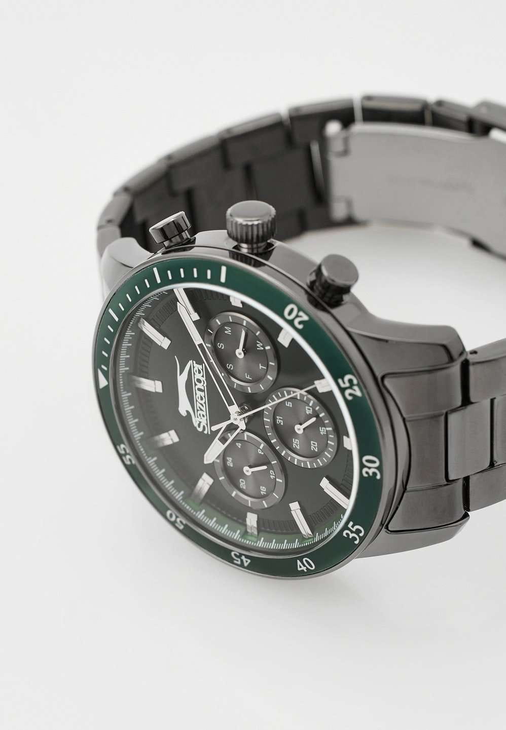 Часы Slazenger SL.09.2260.2.02 сочетают в себе выразительный дизайн и практичность, делая их отличным выбором для современного мужчины. Корпус и браслет выполнены из суперметалла с черным IP-покрытиеIP-покрытиеМетод ионного напыления. Демонстрирует повышенную устойчивость к истиранию, окислению и химическим веществам. Под воздействием высокого давления и температуры около 1500°C молекулы металла надёжно соединяются с частицами корпуса часов. — прочного сплава на основе меди с низким содержанием цинка и никеля, что обеспечивает долговечность изделия. На безельБезельВнешний ободок, закрепляющий стекло. В спортивных часах так называется поворотное кольцо с делениями на циферблате, выполняет роль таймера – замеряет отрезки времени на шкале. Неподвижный безель – элемент декора. Однонаправленно вращающийся безель на дайверских часах позволяет фиксировать моменты погружения и выныривания на поверхность. нанесено зеленое IP-покрытиеIP-покрытиеМетод ионного напыления. Демонстрирует повышенную устойчивость к истиранию, окислению и химическим веществам. Под воздействием высокого давления и температуры около 1500°C молекулы металла надёжно соединяются с частицами корпуса часов., что придает аксессуару утончённый и универсальный внешний вид. Модель оснащена точным кварцевым механизмом, защищённым минеральным стекломМинеральное стеклоМинеральное стекло представляет собой искусственно выращенный минерал кварца. Такое стекло отличается особой устойчивостью к повреждениям и царапинам. Уступает по некоторым качествам сапфировому стеклу.. На зеленом циферблате размещены дополнительные индикаторы: 24-часовой формат времени, дата и день недели. Класс водозащиты 5 бар позволяет не беспокоиться о брызгах и дожде. Диаметр корпуса составляет 45 мм, толщина — 12 мм, что придаёт часам солидный и современный вид. Стрелки с люминесцентным покрытиемЛюминесцентное покрытиеПозволяет считывать показания времени в темноте. Производители наносят на стрелки, часовые индексы, безель или поверхность циферблата светонакопительный состав, дающий холодное свечение. удобно подсвечиваются в темноте после зарядки на свету. Стальной браслет с раскладной застёжкойРаскладная застёжкаТакой тип застёжки используется только на браслетах из металла. Она никогда не раскрывается полностью, происходит разделение на 2 и более частей. Раскладывающая застёжка снизит вероятность потери часов к минимуму. обеспечивает комфортную посадку. Модель станет надёжным спутником как на каждый день, так и для особых случаев, а также превосходно подойдёт в качестве подарка.