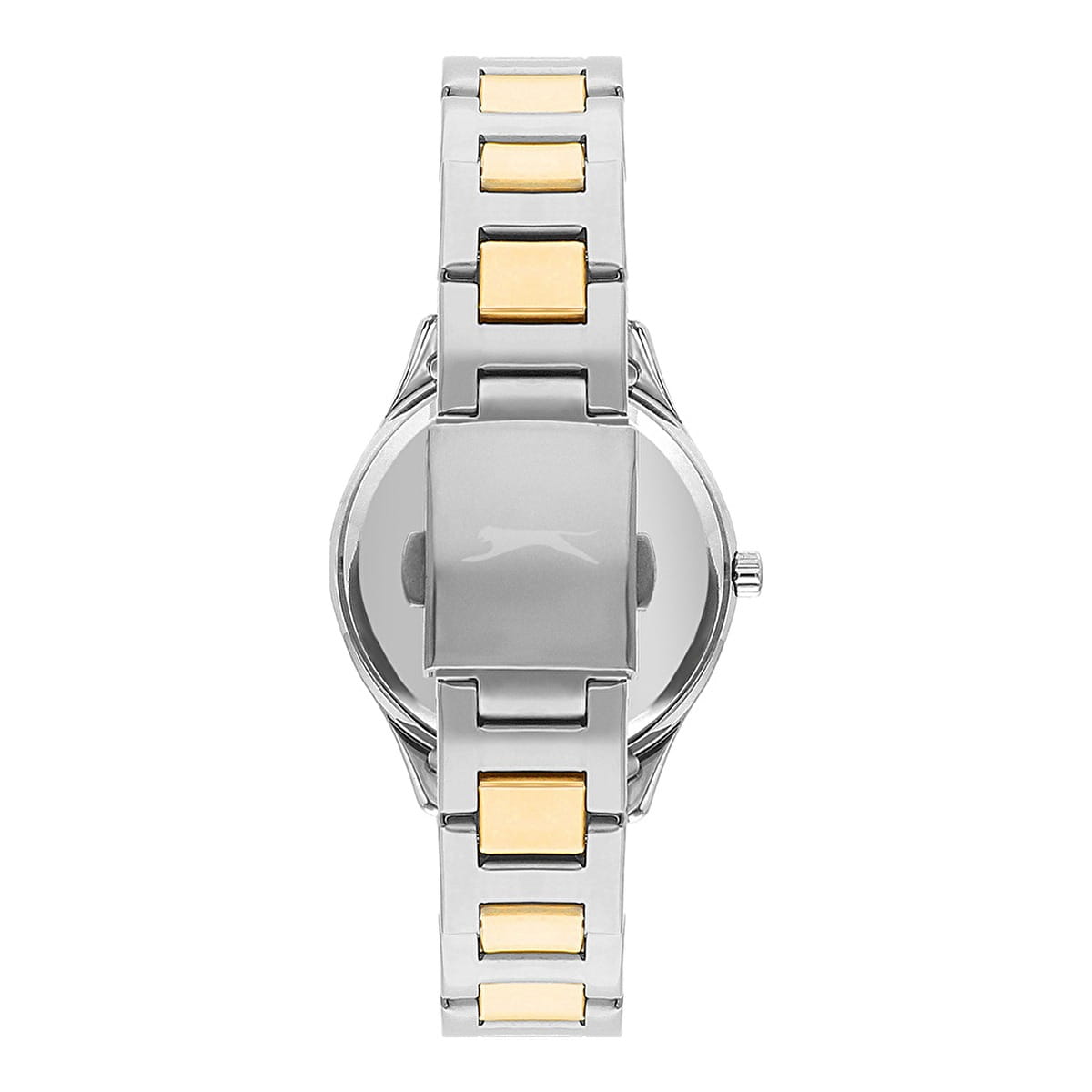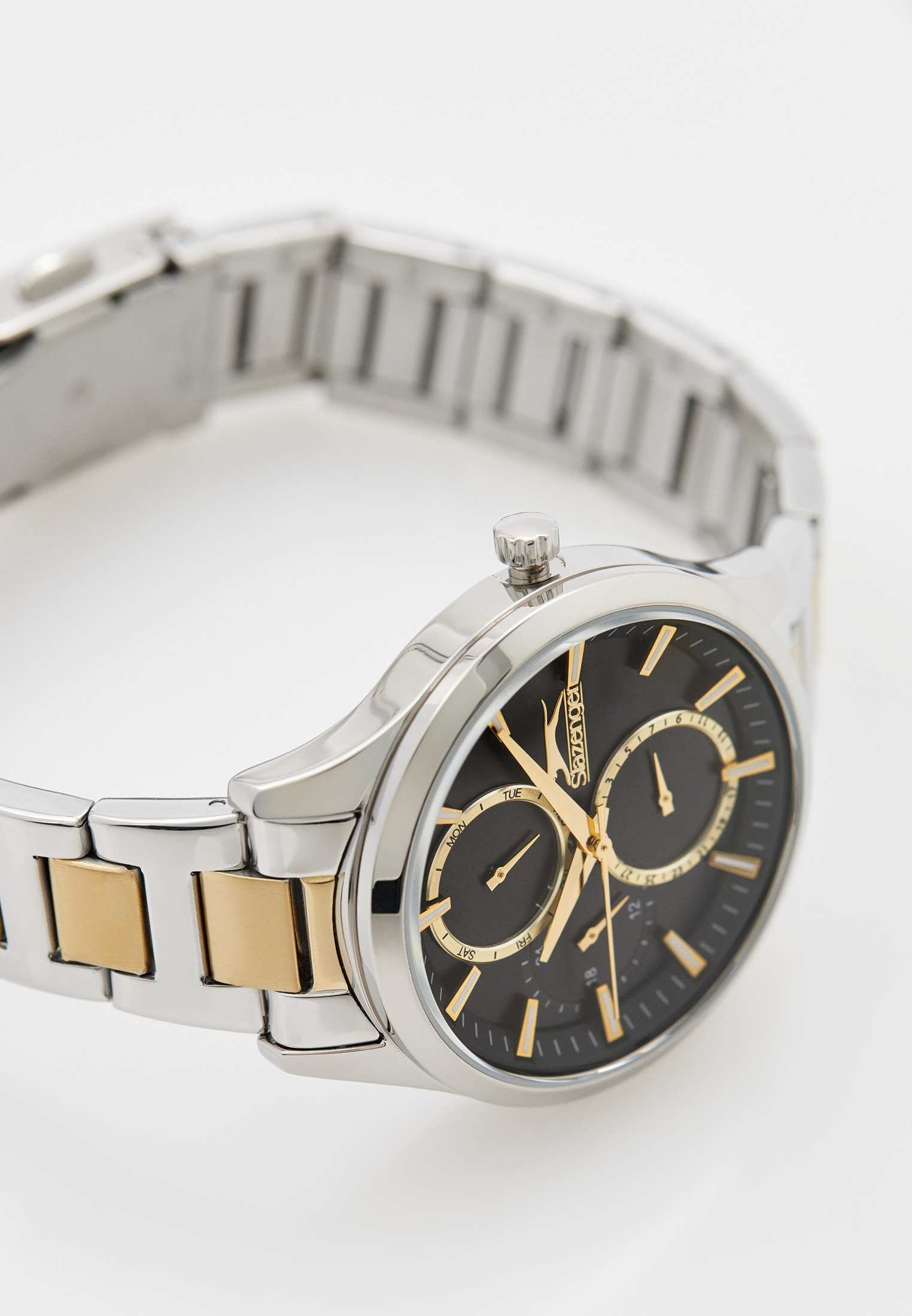 Часы Slazenger SL.09.2284.4.04 — это изящный и функциональный аксессуар, который гармонично дополнит ваш образ и подчеркнет индивидуальность. Корпус и браслет выполнены из инновационного суперметалла — сплава на основе меди с пониженным содержанием цинка и никеля, что обеспечивает долговечность и надежную защиту от внешних воздействий. Черный циферблат, защищенный прочным минеральным стекломМинеральное стеклоМинеральное стекло представляет собой искусственно выращенный минерал кварца. Такое стекло отличается особой устойчивостью к повреждениям и царапинам. Уступает по некоторым качествам сапфировому стеклу., оснащен дополнительными индикаторами: отдельные циферблаты отображают 24-часовой формат времени, текущую дату и день недели, что делает использование часов максимально удобным в повседневной жизни. Диаметр корпуса составляет 35 мм, а толщина — 11 мм, благодаря чему модель комфортно располагается на запястье. Браслет с частичным золотистым IP-покрытиемIP-покрытиеМетод ионного напыления. Демонстрирует повышенную устойчивость к истиранию, окислению и химическим веществам. Под воздействием высокого давления и температуры около 1500°C молекулы металла надёжно соединяются с частицами корпуса часов. и раскладной застёжкойРаскладная застёжкаТакой тип застёжки используется только на браслетах из металла. Она никогда не раскрывается полностью, происходит разделение на 2 и более частей. Раскладывающая застёжка снизит вероятность потери часов к минимуму. обеспечивает комфортную посадку. Метки с люминесцентным покрытиемЛюминесцентное покрытиеПозволяет считывать показания времени в темноте. Производители наносят на стрелки, часовые индексы, безель или поверхность циферблата светонакопительный состав, дающий холодное свечение. удобно подсвечиваются в темноте после зарядки на свету.  Класс водонепроницаемости 3 атм защищает механизм от случайных брызг и капель дождя. Кварцевый механизм гарантирует точность хода и простоту эксплуатации.