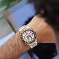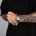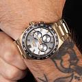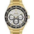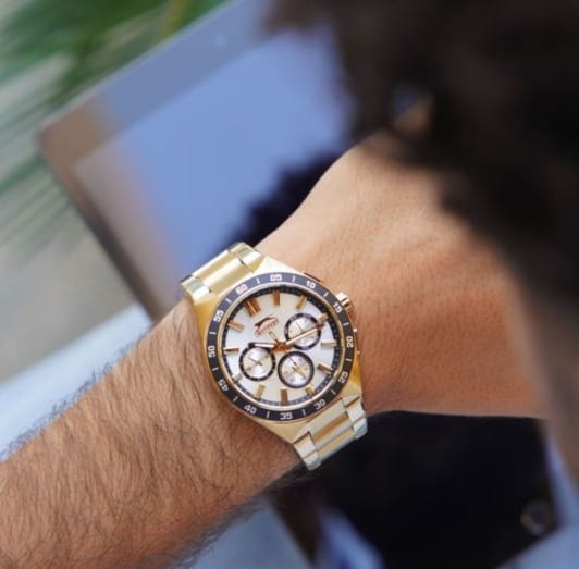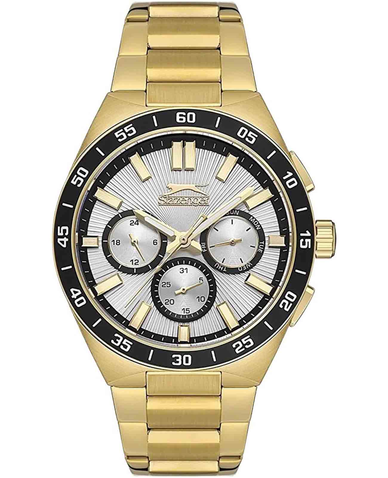 Часы Slazenger SL.09.2285.2.06 — это стильное решение для тех, кто ценит сочетание выразительного дизайна и функциональности. Модель оснащена надежным кварцевым механизмом, который заключен в прочный корпус диаметром 45 мм и толщиной 13 мм, выполненный из суперметалла с золотистым IP-покрытиемIP-покрытиеМетод ионного напыления. Демонстрирует повышенную устойчивость к истиранию, окислению и химическим веществам. Под воздействием высокого давления и температуры около 1500°C молекулы металла надёжно соединяются с частицами корпуса часов. — современного сплава на основе меди с пониженным содержанием цинка и никеля, обладающего высокой прочностью и устойчивостью к износу, а на безельБезельВнешний ободок, закрепляющий стекло. В спортивных часах так называется поворотное кольцо с делениями на циферблате, выполняет роль таймера – замеряет отрезки времени на шкале. Неподвижный безель – элемент декора. Однонаправленно вращающийся безель на дайверских часах позволяет фиксировать моменты погружения и выныривания на поверхность. нанесено черное IP-покрытиеIP-покрытиеМетод ионного напыления. Демонстрирует повышенную устойчивость к истиранию, окислению и химическим веществам. Под воздействием высокого давления и температуры около 1500°C молекулы металла надёжно соединяются с частицами корпуса часов. и секундная шкала. Минеральное стеклоМинеральное стеклоМинеральное стекло представляет собой искусственно выращенный минерал кварца. Такое стекло отличается особой устойчивостью к повреждениям и царапинам. Уступает по некоторым качествам сапфировому стеклу. защищает серебристый циферблат от царапин и повреждений. Часы оснащены дополнительными циферблатами для отображения 24-часового времени, даты и дня недели, что делает использование еще более удобным. Браслет также выполнен из суперметалла с золотистым IP-покрытиемIP-покрытиеМетод ионного напыления. Демонстрирует повышенную устойчивость к истиранию, окислению и химическим веществам. Под воздействием высокого давления и температуры около 1500°C молекулы металла надёжно соединяются с частицами корпуса часов. и с раскладной застёжкойРаскладная застёжкаТакой тип застёжки используется только на браслетах из металла. Она никогда не раскрывается полностью, происходит разделение на 2 и более частей. Раскладывающая застёжка снизит вероятность потери часов к минимуму. и гармонично дополняет общий облик аксессуара. Циферблат оснащён люминесцентным покрытиемЛюминесцентное покрытиеПозволяет считывать показания времени в темноте. Производители наносят на стрелки, часовые индексы, безель или поверхность циферблата светонакопительный состав, дающий холодное свечение. стрелок и меток, что позволяет легко определять время даже в условиях плохой освещенности. Класс водозащиты 5 АТМ позволяет не бояться случайных брызг и дождя, а гарантия 12 месяцев подтверждает высокое качество изделия.