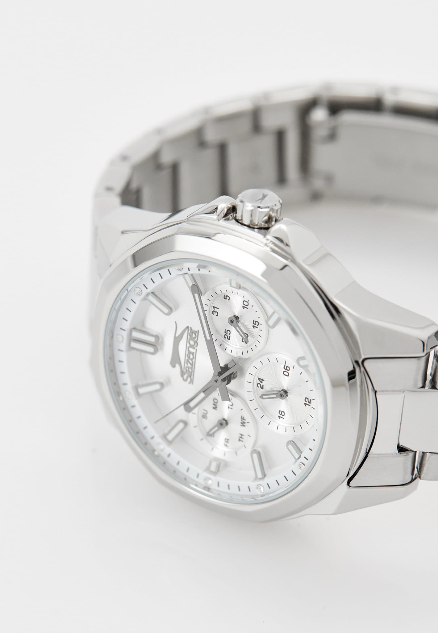 Часы Slazenger SL.09.2290.4.04 — это сочетание современного дизайна и функциональности, идеально подходящее для тех, кто ценит стиль и элегантность. Корпус и браслет выполнены из прочного суперметалла, что придаёт модели солидный и эффектный вид. Серебристый циферблат с лаконичными отметками, кристаллами и фирменным логотипом защищён устойчивым к царапинам минеральным стекломМинеральное стеклоМинеральное стекло представляет собой искусственно выращенный минерал кварца. Такое стекло отличается особой устойчивостью к повреждениям и царапинам. Уступает по некоторым качествам сапфировому стеклу.. Дополнительные функции включают отображение даты и дня недели, а также 12- и 24-часовой формат времени на отдельных мини-циферблатах, что делает использование часов максимально удобным. Заводная головка оснащена защитой, а надёжная раскладная застёжкаРаскладная застёжкаТакой тип застёжки используется только на браслетах из металла. Она никогда не раскрывается полностью, происходит разделение на 2 и более частей. Раскладывающая застёжка снизит вероятность потери часов к минимуму. обеспечивает комфортную посадку на запястье. Особое внимание привлекает восьмигранный безельБезельВнешний ободок, закрепляющий стекло. В спортивных часах так называется поворотное кольцо с делениями на циферблате, выполняет роль таймера – замеряет отрезки времени на шкале. Неподвижный безель – элемент декора. Однонаправленно вращающийся безель на дайверских часах позволяет фиксировать моменты погружения и выныривания на поверхность.. Циферблат оснащён люминесцентным покрытиемЛюминесцентное покрытиеПозволяет считывать показания времени в темноте. Производители наносят на стрелки, часовые индексы, безель или поверхность циферблата светонакопительный состав, дающий холодное свечение. стрелок и меток, что позволяет легко определять время даже в условиях плохой освещенности. Водозащита 30WR позволяет не беспокоиться о случайных брызгах и дождевых каплях. Диаметр корпуса составляет 36 мм, толщина — 12 мм, вес — 97 г, благодаря чему часы выглядят внушительно и подчёркивают индивидуальный стиль владельца. Эта модель станет отличным акцентом в вашем образе и подчеркнёт вашу уверенность в любой ситуации.