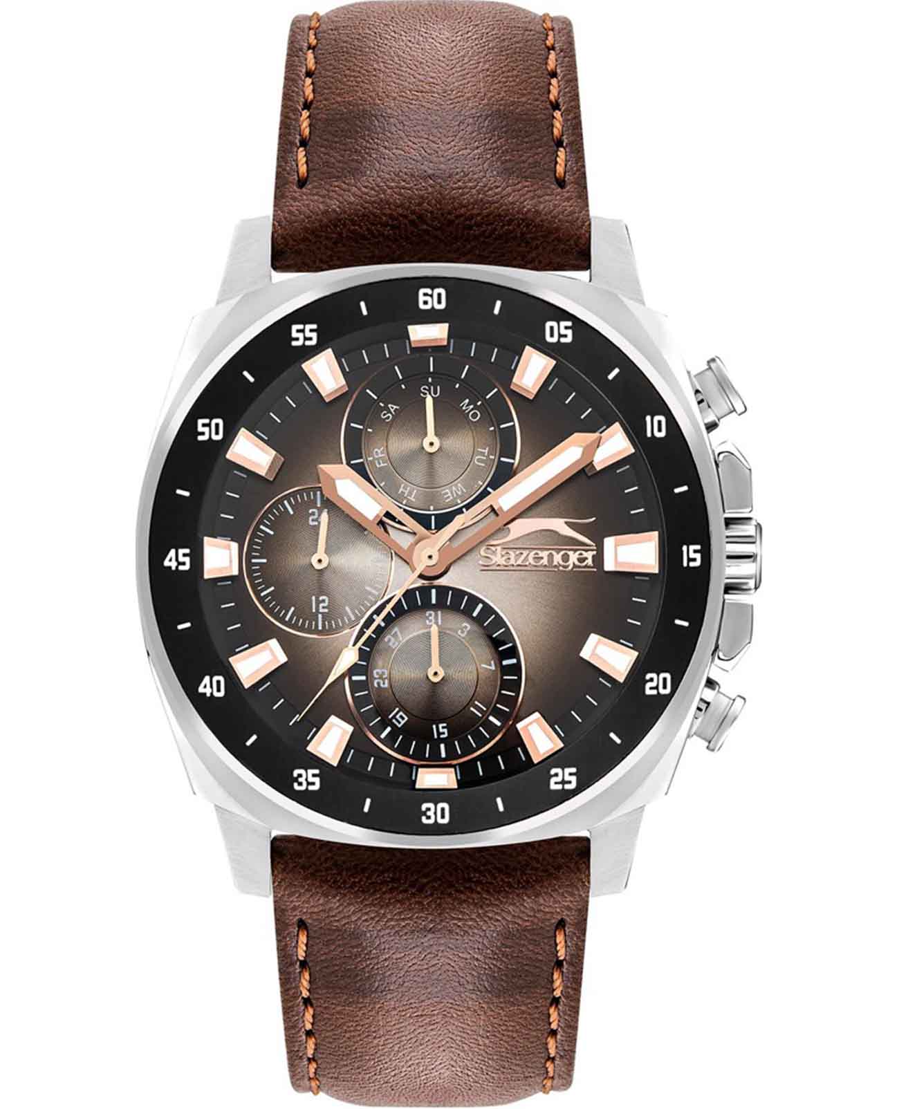 Slazenger SL.09.2293.2.06 — это стильные наручные часы, выполненные в современном дизайне и отлично подходящие для повседневного использования. Корпус диаметром 45 мм изготовлен из прочного металла и дополнен минеральным стекломМинеральное стеклоМинеральное стекло представляет собой искусственно выращенный минерал кварца. Такое стекло отличается особой устойчивостью к повреждениям и царапинам. Уступает по некоторым качествам сапфировому стеклу., которое защищает градиентный коричневый циферблат. Коричневый кожаный ремешок шириной 24 мм оснащён надежной классической застежкой, которая обеспечивает комфортную посадку на руке. Кварцевый механизм гарантирует точный ход, а водозащита уровня WR 50 позволяет не снимать часы во время мытья рук или под дождём. Модель оснащена люминесцентным покрытиемЛюминесцентное покрытиеПозволяет считывать показания времени в темноте. Производители наносят на стрелки, часовые индексы, безель или поверхность циферблата светонакопительный состав, дающий холодное свечение. стрелок и меток, что облегчает считывание времени в темноте. Дополнительные малые циферблаты отображают дату, день недели и текущее время в 24-часовом формате. Часы также оснащены заводной головкой с защитой и безелемБезельВнешний ободок, закрепляющий стекло. В спортивных часах так называется поворотное кольцо с делениями на циферблате, выполняет роль таймера – замеряет отрезки времени на шкале. Неподвижный безель – элемент декора. Однонаправленно вращающийся безель на дайверских часах позволяет фиксировать моменты погружения и выныривания на поверхность. с черным IP-покрытиемIP-покрытиеМетод ионного напыления. Демонстрирует повышенную устойчивость к истиранию, окислению и химическим веществам. Под воздействием высокого давления и температуры около 1500°C молекулы металла надёжно соединяются с частицами корпуса часов. и секундной разметкой. Вес изделия составляет 80 грамм.