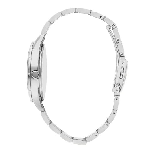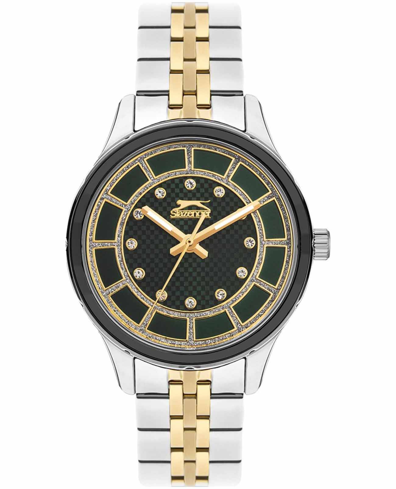 Женские наручные часы Slazenger SL.09.2295.3.02 — это элегантный аксессуар, который подчеркнет утончённый стиль своей обладательницы. Корпус диаметром 36 мм и толщиной 11,5 мм выполнен из прочного металла и надёжно защищён минеральным стекломМинеральное стеклоМинеральное стекло представляет собой искусственно выращенный минерал кварца. Такое стекло отличается особой устойчивостью к повреждениям и царапинам. Уступает по некоторым качествам сапфировому стеклу., устойчивым к царапинам. Зеленый циферблат украшен изящными кристаллами, придающими часам особый блеск и изысканность. Модель оснащена люминесцентным покрытиемЛюминесцентное покрытиеПозволяет считывать показания времени в темноте. Производители наносят на стрелки, часовые индексы, безель или поверхность циферблата светонакопительный состав, дающий холодное свечение. стрелок, что облегчает считывание времени в темноте. Особое внимание привлекает безельБезельВнешний ободок, закрепляющий стекло. В спортивных часах так называется поворотное кольцо с делениями на циферблате, выполняет роль таймера – замеряет отрезки времени на шкале. Неподвижный безель – элемент декора. Однонаправленно вращающийся безель на дайверских часах позволяет фиксировать моменты погружения и выныривания на поверхность. с черным IP-покрытиемIP-покрытиеМетод ионного напыления. Демонстрирует повышенную устойчивость к истиранию, окислению и химическим веществам. Под воздействием высокого давления и температуры около 1500°C молекулы металла надёжно соединяются с частицами корпуса часов.. Металлический браслет с частичным золотистым IP-покрытиемIP-покрытиеМетод ионного напыления. Демонстрирует повышенную устойчивость к истиранию, окислению и химическим веществам. Под воздействием высокого давления и температуры около 1500°C молекулы металла надёжно соединяются с частицами корпуса часов. шириной 16 мм оснащён удобной раскладной застёжкойРаскладная застёжкаТакой тип застёжки используется только на браслетах из металла. Она никогда не раскрывается полностью, происходит разделение на 2 и более частей. Раскладывающая застёжка снизит вероятность потери часов к минимуму. для комфортной посадки на запястье. Кварцевый механизм обеспечивает точность хода, а водозащита уровня WR 30 защищает часы от случайных брызг. Для удобства в условиях плохой освещённости предусмотрена подсветка стрелок. Вес изделия составляет 95 граммов.