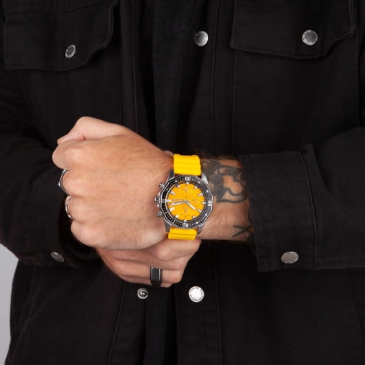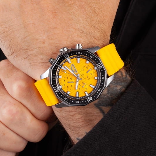 Мужские кварцевые часы Slazenger SL.09.2298.2.02 — это выразительный и функциональный аксессуар, сочетающий прочность, стиль и насыщенную комплектацию. Корпус выполнен из суперметалла с PVD-покрытиемPVDУльтратонкое покрытие наносится в технике вакуумного напыления, сочетает в себе нитрид титана особой прочности со слоем золота или оксида хрома. Несёт в себе декоративную или защитную функцию., а лицевая часть защищена минеральным стекломМинеральное стеклоМинеральное стекло представляет собой искусственно выращенный минерал кварца. Такое стекло отличается особой устойчивостью к повреждениям и царапинам. Уступает по некоторым качествам сапфировому стеклу.. Циферблат оранжевого цвета оформлен с вынесенными малыми циферблатами для индикации дня недели, даты и 24-часового формата времени. Стрелки и метки покрыты люминесцентным покрытиемЛюминесцентное покрытиеПозволяет считывать показания времени в темноте. Производители наносят на стрелки, часовые индексы, безель или поверхность циферблата светонакопительный состав, дающий холодное свечение., что обеспечивает хорошую читаемость в темноте. Часы оснащены силиконовым ремешком, фиксирующимся на стандартной застёжке. Водонепроницаемость 50 м позволяет использовать часы в повседневных условиях, защищая от случайных брызг и капель дождя. Модель подчёркивает индивидуальность владельца и идеально подходит как для повседневного, так и для спортивного образа.