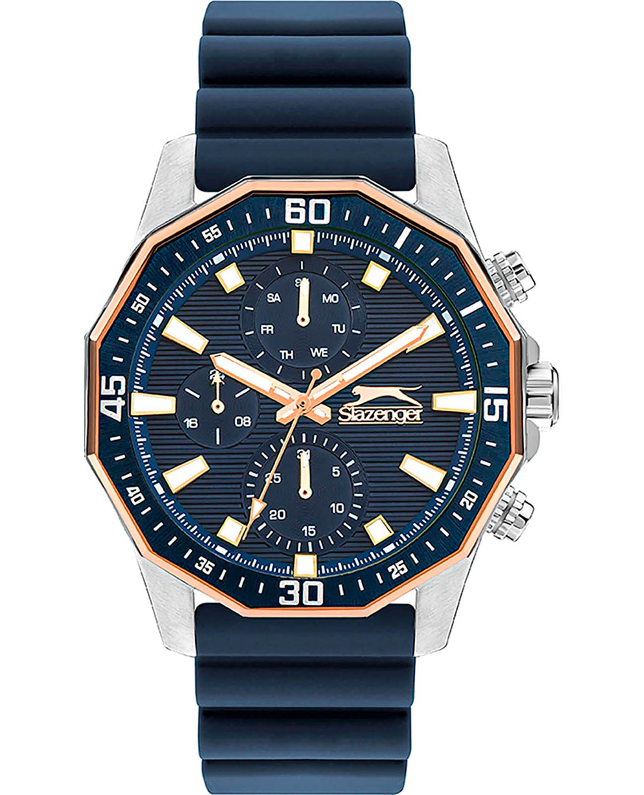 Мужские кварцевые часы Slazenger SL.09.2298.2.03 — это выразительный и функциональный аксессуар, сочетающий прочность, стиль и насыщенную комплектацию. Корпус выполнен из суперметалла с PVD-покрытиемPVDУльтратонкое покрытие наносится в технике вакуумного напыления, сочетает в себе нитрид титана особой прочности со слоем золота или оксида хрома. Несёт в себе декоративную или защитную функцию., а лицевая часть защищена минеральным стекломМинеральное стеклоМинеральное стекло представляет собой искусственно выращенный минерал кварца. Такое стекло отличается особой устойчивостью к повреждениям и царапинам. Уступает по некоторым качествам сапфировому стеклу.. Циферблат синего цвета оформлен с вынесенными малыми циферблатами для индикации дня недели, даты и 24-часового формата времени. Стрелки и метки покрыты люминесцентным покрытиемЛюминесцентное покрытиеПозволяет считывать показания времени в темноте. Производители наносят на стрелки, часовые индексы, безель или поверхность циферблата светонакопительный состав, дающий холодное свечение., что обеспечивает хорошую читаемость в темноте. Заводная головка снабжена защитой, а задняя крышка — завинчивающаяся, что повышает надёжность конструкции. Часы оснащены силиконовым ремешком синего цвета, фиксирующимся на стандартной застёжке. Водонепроницаемость 50 м позволяет использовать часы в повседневных условиях, защищая от случайных брызг и капель дождя. Модель подчёркивает индивидуальность владельца и идеально подходит как для повседневного, так и для спортивного образа.