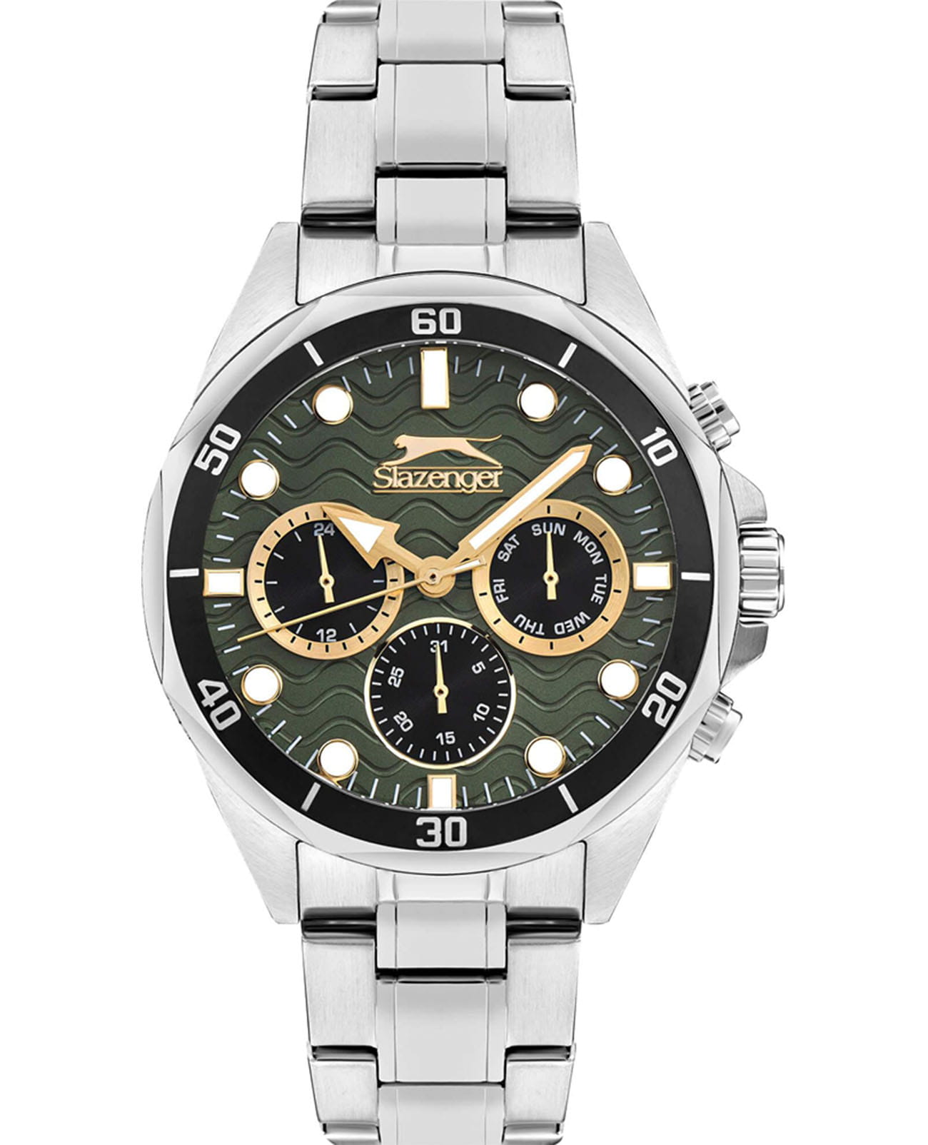 Мужские кварцевые часы Slazenger SL.09.2309.2.06 — это выразительный и функциональный аксессуар, сочетающий прочность, стиль и насыщенную комплектацию. Корпус и браслет выполнены из суперметалла, защищён минеральным стекломМинеральное стеклоМинеральное стекло представляет собой искусственно выращенный минерал кварца. Такое стекло отличается особой устойчивостью к повреждениям и царапинам. Уступает по некоторым качествам сапфировому стеклу.. Циферблат зелёного цвета оформлен с вынесенными малыми циферблатами для индикации дня недели, даты и времени в 24-часовом формате. Стрелки и метки оснащены люминесцентным покрытиемЛюминесцентное покрытиеПозволяет считывать показания времени в темноте. Производители наносят на стрелки, часовые индексы, безель или поверхность циферблата светонакопительный состав, дающий холодное свечение., обеспечивающим хорошую читаемость в темноте. Заводная головка снабжена защитой, а задняя крышка — завинчивающаяся, что повышает надёжность конструкции. Браслет из суперметалла фиксируется на раскладной застёжкеРаскладная застёжкаТакой тип застёжки используется только на браслетах из металла. Она никогда не раскрывается полностью, происходит разделение на 2 и более частей. Раскладывающая застёжка снизит вероятность потери часов к минимуму., обеспечивая удобство и безопасность ношения. Водонепроницаемость 50 м позволяет использовать часы в повседневных условиях, защищая от случайных брызг и капель дождя. Модель подчёркивает индивидуальность владельца и идеально подходит как для повседневного, так и для делового образа.