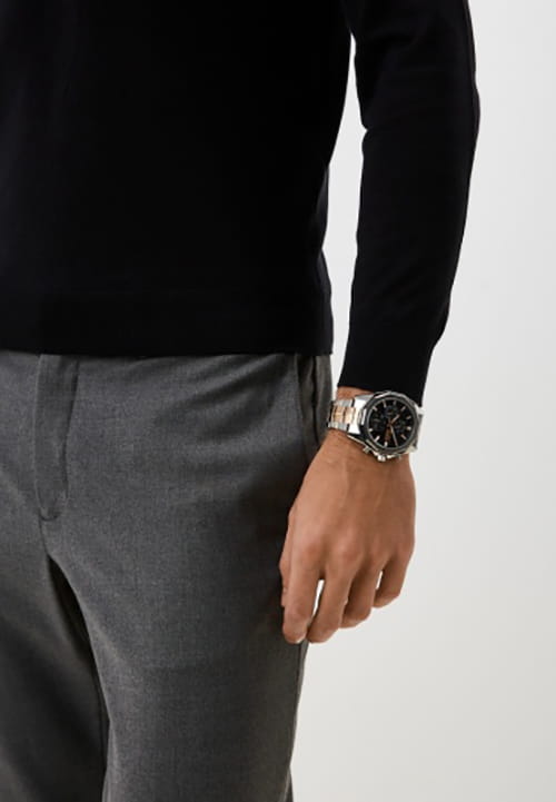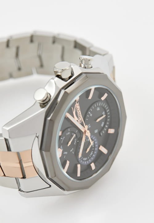Мужские кварцевые часы Slazenger SL.09.2312.2.02 — это выразительный и функциональный аксессуар, сочетающий прочность, стиль и насыщенную комплектацию. Браслет выполнены из суперметалла с IP-покрытиемIP-покрытиеМетод ионного напыления. Демонстрирует повышенную устойчивость к истиранию, окислению и химическим веществам. Под воздействием высокого давления и температуры около 1500°C молекулы металла надёжно соединяются с частицами корпуса часов., корпус из суперметалла оснащён минеральным стекломМинеральное стеклоМинеральное стекло представляет собой искусственно выращенный минерал кварца. Такое стекло отличается особой устойчивостью к повреждениям и царапинам. Уступает по некоторым качествам сапфировому стеклу.. Циферблат чёрного цвета оформлен с вынесенными малыми циферблатами для индикации дня недели, даты и времени в 24-часовом формате. Стрелки и метки оснащены люминесцентным покрытиемЛюминесцентное покрытиеПозволяет считывать показания времени в темноте. Производители наносят на стрелки, часовые индексы, безель или поверхность циферблата светонакопительный состав, дающий холодное свечение., обеспечивающим хорошую читаемость в темноте. Заводная головка снабжена защитой, а задняя крышка — завинчивающаяся, что повышает надёжность конструкции. Браслет комбинированного цвета фиксируется на раскладной застёжкеРаскладная застёжкаТакой тип застёжки используется только на браслетах из металла. Она никогда не раскрывается полностью, происходит разделение на 2 и более частей. Раскладывающая застёжка снизит вероятность потери часов к минимуму., обеспечивая удобство и безопасность ношения. Водонепроницаемость 50 м позволяет использовать часы в повседневных условиях, защищая от случайных брызг и капель дождя. Модель подчёркивает индивидуальность владельца и идеально подходит как для повседневного, так и для делового образа.