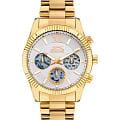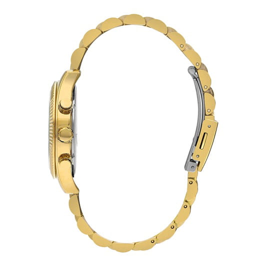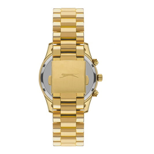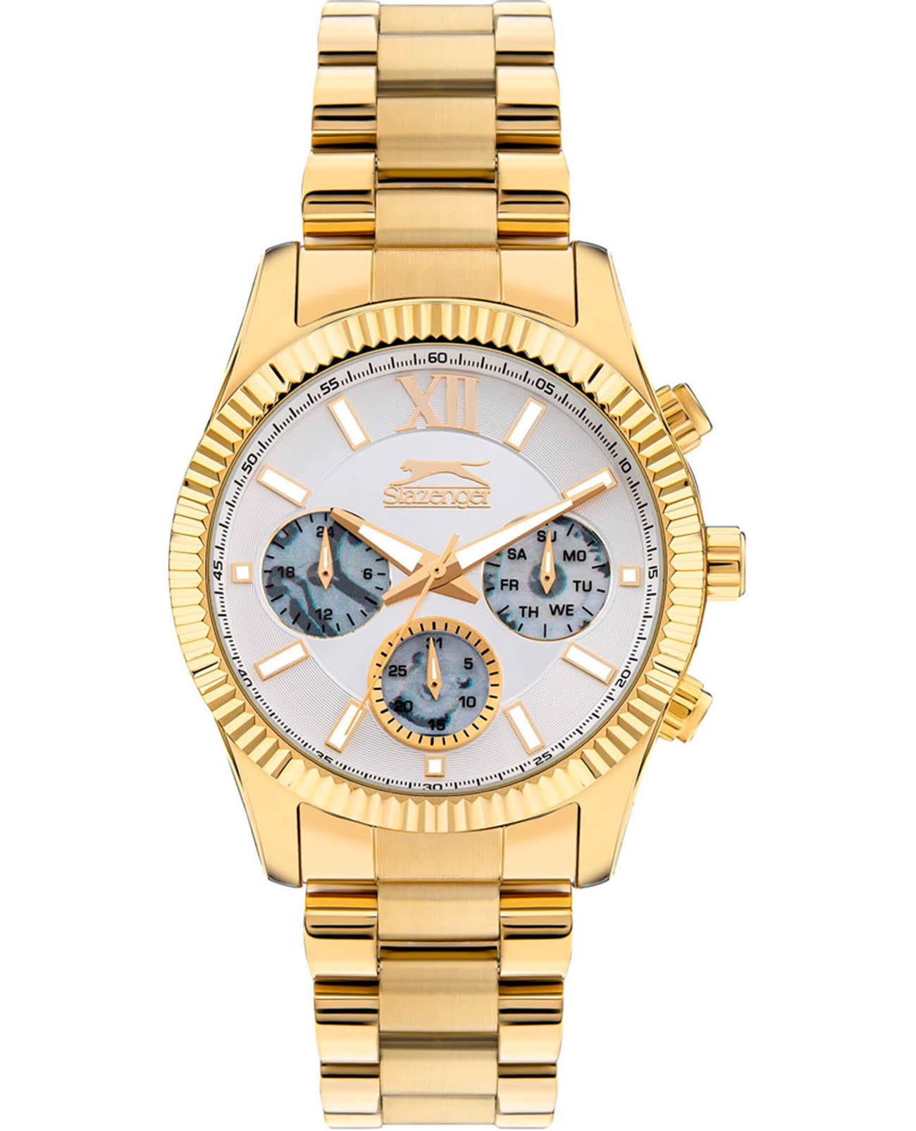 Мужские кварцевые часы Slazenger SL.09.2316.2.05 - это выразительный и функциональный аксессуар, сочетающий прочность, стиль и насыщенную комплектацию. Корпус и браслет выполнены из суперметалла с IP-покрытиемIP-покрытиеМетод ионного напыления. Демонстрирует повышенную устойчивость к истиранию, окислению и химическим веществам. Под воздействием высокого давления и температуры около 1500°C молекулы металла надёжно соединяются с частицами корпуса часов.. Циферблат белого цвета защищён минеральным стекломМинеральное стеклоМинеральное стекло представляет собой искусственно выращенный минерал кварца. Такое стекло отличается особой устойчивостью к повреждениям и царапинам. Уступает по некоторым качествам сапфировому стеклу. и оформлен с вынесенными малыми циферблатами для индикации дня недели, даты и времени в 24-часовом формате. Стрелки и метки оснащены люминесцентным покрытиемЛюминесцентное покрытиеПозволяет считывать показания времени в темноте. Производители наносят на стрелки, часовые индексы, безель или поверхность циферблата светонакопительный состав, дающий холодное свечение., обеспечивающим хорошую читаемость в темноте. Завинчивающаяся задняя крышка повышает надёжность конструкции. Браслет золотистого цвета фиксируется на раскладной застёжкеРаскладная застёжкаТакой тип застёжки используется только на браслетах из металла. Она никогда не раскрывается полностью, происходит разделение на 2 и более частей. Раскладывающая застёжка снизит вероятность потери часов к минимуму., обеспечивая удобство и безопасность ношения. Водонепроницаемость 50 м позволяет использовать часы в повседневных условиях, защищая от случайных брызг и капель дождя. Модель подчёркивает индивидуальность владельца и идеально подходит как для повседневного, так и для делового образа.