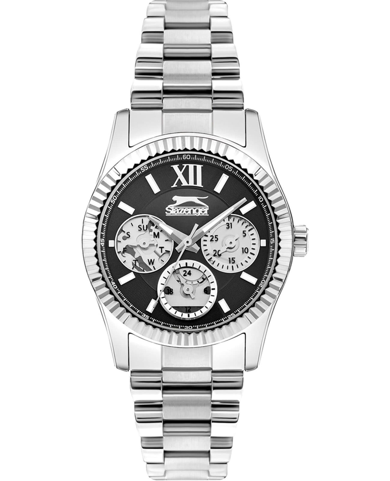 Женские кварцевые часы Slazenger SL.09.2317.4.02 — это выразительный и функциональный аксессуар, сочетающий стиль, прочность и насыщенную комплектацию. Корпус и браслет выполнены из суперметалла. Циферблат чёрного цвета защищён минеральным стекломМинеральное стеклоМинеральное стекло представляет собой искусственно выращенный минерал кварца. Такое стекло отличается особой устойчивостью к повреждениям и царапинам. Уступает по некоторым качествам сапфировому стеклу. и оформлен с вынесенными малыми циферблатами для индикации дня недели, даты и времени в 24-часовом формате. Стрелки и метки оснащены люминесцентным покрытиемЛюминесцентное покрытиеПозволяет считывать показания времени в темноте. Производители наносят на стрелки, часовые индексы, безель или поверхность циферблата светонакопительный состав, дающий холодное свечение., обеспечивающим хорошую читаемость в темноте. Браслет из суперметалла фиксируется на раскладной застёжкеРаскладная застёжкаТакой тип застёжки используется только на браслетах из металла. Она никогда не раскрывается полностью, происходит разделение на 2 и более частей. Раскладывающая застёжка снизит вероятность потери часов к минимуму., обеспечивая удобство и надёжность ношения. Водонепроницаемость 30 м позволяет использовать часы в повседневных условиях, защищая от случайных брызг и капель дождя. Модель подчёркивает индивидуальность владельца и идеально подходит как для повседневного, так и для торжественного образа.