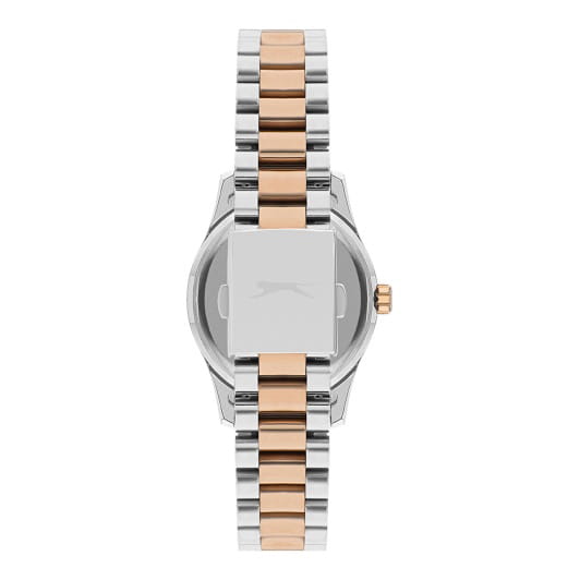 Женские кварцевые часы Slazenger SL.09.2317.4.04 — это выразительный и функциональный аксессуар, сочетающий стиль, прочность и насыщенную комплектацию. Безель и браслет выполнены из суперметалла с частичным IP-покрытиемIP-покрытиеМетод ионного напыления. Демонстрирует повышенную устойчивость к истиранию, окислению и химическим веществам. Под воздействием высокого давления и температуры около 1500°C молекулы металла надёжно соединяются с частицами корпуса часов.. Циферблат чёрного цвета защищён минеральным стекломМинеральное стеклоМинеральное стекло представляет собой искусственно выращенный минерал кварца. Такое стекло отличается особой устойчивостью к повреждениям и царапинам. Уступает по некоторым качествам сапфировому стеклу. и оформлен с вынесенными малыми циферблатами для индикации дня недели, даты и времени в 24-часовом формате. Стрелки и метки оснащены люминесцентным покрытиемЛюминесцентное покрытиеПозволяет считывать показания времени в темноте. Производители наносят на стрелки, часовые индексы, безель или поверхность циферблата светонакопительный состав, дающий холодное свечение., обеспечивающим хорошую читаемость в темноте. Браслет комбинированного цвета фиксируется на раскладной застёжкеРаскладная застёжкаТакой тип застёжки используется только на браслетах из металла. Она никогда не раскрывается полностью, происходит разделение на 2 и более частей. Раскладывающая застёжка снизит вероятность потери часов к минимуму., обеспечивая удобство и надёжность ношения. Водонепроницаемость 30 м позволяет использовать часы в повседневных условиях, защищая от случайных брызг и капель дождя. Модель подчёркивает индивидуальность владельца и идеально подходит как для повседневного, так и для торжественного образа.