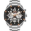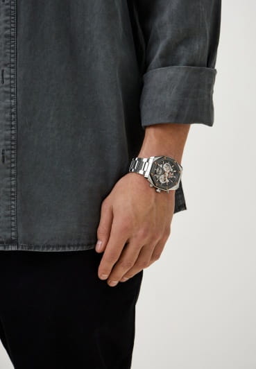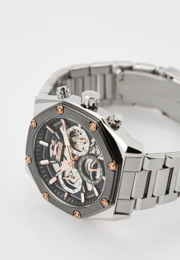 Мужские кварцевые часы Slazenger SL.09.2318.2.03 - это выразительный и функциональный аксессуар, сочетающий стиль, технологичность и насыщенную комплектацию. Корпус и браслет выполнены из суперметалла. БезельБезельВнешний ободок, закрепляющий стекло. В спортивных часах так называется поворотное кольцо с делениями на циферблате, выполняет роль таймера – замеряет отрезки времени на шкале. Неподвижный безель – элемент декора. Однонаправленно вращающийся безель на дайверских часах позволяет фиксировать моменты погружения и выныривания на поверхность. с IP-покрытиемIP-покрытиеМетод ионного напыления. Демонстрирует повышенную устойчивость к истиранию, окислению и химическим веществам. Под воздействием высокого давления и температуры около 1500°C молекулы металла надёжно соединяются с частицами корпуса часов.. Циферблат защищён минеральным стекломМинеральное стеклоМинеральное стекло представляет собой искусственно выращенный минерал кварца. Такое стекло отличается особой устойчивостью к повреждениям и царапинам. Уступает по некоторым качествам сапфировому стеклу. и частично скелетонизирован, что позволяет наблюдать за работой механизма, и дополнен вынесенными малыми циферблатами для индикации дня недели, даты и времени в 24-часовом формате. Стрелки и метки оснащены люминесцентным покрытиемЛюминесцентное покрытиеПозволяет считывать показания времени в темноте. Производители наносят на стрелки, часовые индексы, безель или поверхность циферблата светонакопительный состав, дающий холодное свечение., обеспечивающим хорошую читаемость в темноте. Браслет из суперметалла фиксируется на раскладной застёжкеРаскладная застёжкаТакой тип застёжки используется только на браслетах из металла. Она никогда не раскрывается полностью, происходит разделение на 2 и более частей. Раскладывающая застёжка снизит вероятность потери часов к минимуму., обеспечивая удобство и надёжность ношения. Водонепроницаемость 50 м позволяет использовать часы в повседневных условиях, защищая от случайных брызг и капель дождя. Модель подчёркивает индивидуальность владельца и идеально подходит как для повседневного, так и для делового образа.