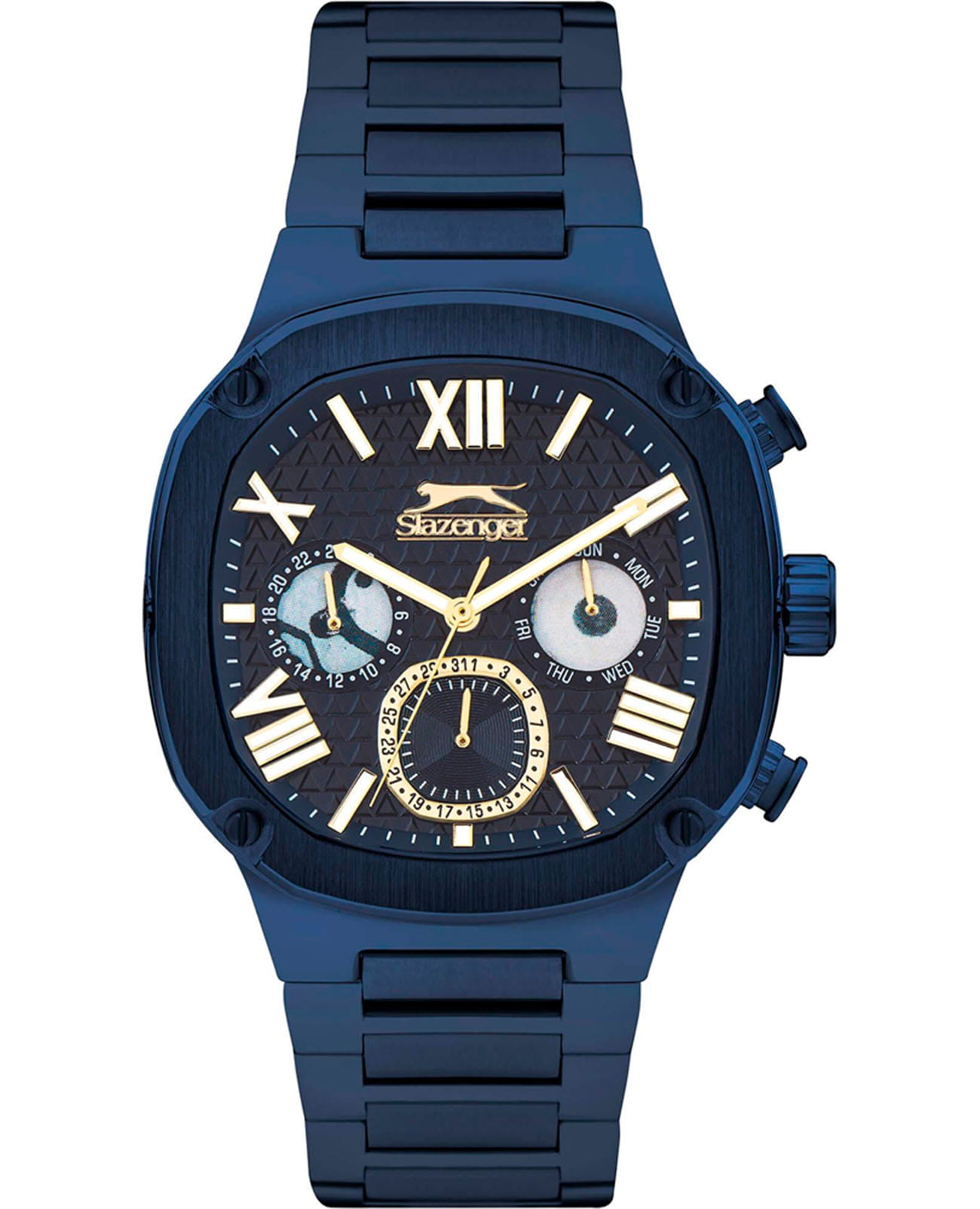 Мужские кварцевые часы Slazenger SL.09.2320.2.04 — это выразительный и функциональный аксессуар, сочетающий стиль, прочность и насыщенную комплектацию. Корпус и браслет выполнены из суперметалла с IP-покрытиемIP-покрытиеМетод ионного напыления. Демонстрирует повышенную устойчивость к истиранию, окислению и химическим веществам. Под воздействием высокого давления и температуры около 1500°C молекулы металла надёжно соединяются с частицами корпуса часов., а циферблат частично скелетонизирован и оформлен в синих тонах, что позволяет наблюдать за работой механизма. Циферблат защищён минеральным стекломМинеральное стеклоМинеральное стекло представляет собой искусственно выращенный минерал кварца. Такое стекло отличается особой устойчивостью к повреждениям и царапинам. Уступает по некоторым качествам сапфировому стеклу. и дополнен вынесенными малыми циферблатами для индикации дня недели, даты и времени в 24-часовом формате. Стрелки и метки оснащены люминесцентным покрытиемЛюминесцентное покрытиеПозволяет считывать показания времени в темноте. Производители наносят на стрелки, часовые индексы, безель или поверхность циферблата светонакопительный состав, дающий холодное свечение., обеспечивающим хорошую читаемость в темноте. Завинчивающаяся задняя крышка повышает надёжность конструкции. Браслет из суперметалла фиксируется на раскладной застёжкеРаскладная застёжкаТакой тип застёжки используется только на браслетах из металла. Она никогда не раскрывается полностью, происходит разделение на 2 и более частей. Раскладывающая застёжка снизит вероятность потери часов к минимуму., обеспечивая удобство и безопасность ношения. Водонепроницаемость 50 м позволяет использовать часы в повседневных условиях, защищая от случайных брызг и капель дождя. Модель подчёркивает индивидуальность владельца и идеально подходит как для повседневного, так и для делового образа.