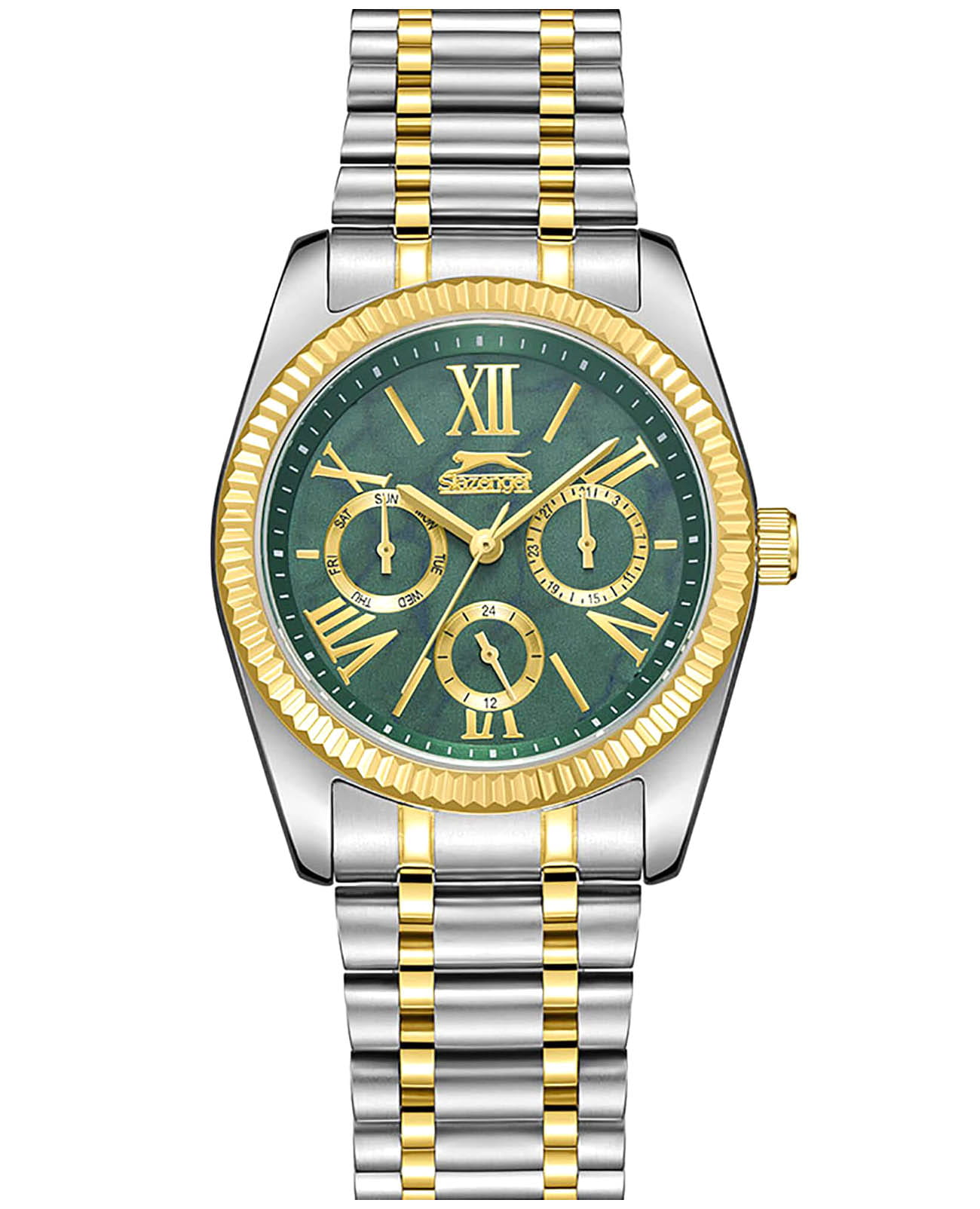 Женские кварцевые часы Slazenger SL.09.2343.4.06 – это сочетание элегантности, современного стиля и надёжности. Изящный корпус из суперметалла серебристого цвета, диаметром 36 мм и толщиной 10.5 мм, подчёркивает утончённость модели и делает их идеальным аксессуаром для любой ситуации – будь то деловая встреча, романтический вечер или повседневные выходы. Циферблат надёжно защищён минеральным стекломМинеральное стеклоМинеральное стекло представляет собой искусственно выращенный минерал кварца. Такое стекло отличается особой устойчивостью к повреждениям и царапинам. Уступает по некоторым качествам сапфировому стеклу., которое устойчиво к механическим повреждениям и сохраняет кристальную прозрачность. Рифленый неподвижный безельБезельВнешний ободок, закрепляющий стекло. В спортивных часах так называется поворотное кольцо с делениями на циферблате, выполняет роль таймера – замеряет отрезки времени на шкале. Неподвижный безель – элемент декора. Однонаправленно вращающийся безель на дайверских часах позволяет фиксировать моменты погружения и выныривания на поверхность. с IP-покрытиемIP-покрытиеМетод ионного напыления. Демонстрирует повышенную устойчивость к истиранию, окислению и химическим веществам. Под воздействием высокого давления и температуры около 1500°C молекулы металла надёжно соединяются с частицами корпуса часов. золотистого цвета. Браслет из суперметалла с частичным IP-покрытиемIP-покрытиеМетод ионного напыления. Демонстрирует повышенную устойчивость к истиранию, окислению и химическим веществам. Под воздействием высокого давления и температуры около 1500°C молекулы металла надёжно соединяются с частицами корпуса часов. удобно облегает запястье и фиксируется с помощью раскладной застёжкиРаскладная застёжкаТакой тип застёжки используется только на браслетах из металла. Она никогда не раскрывается полностью, происходит разделение на 2 и более частей. Раскладывающая застёжка снизит вероятность потери часов к минимуму., обеспечивая надёжность и комфорт в повседневном ношении. Утончённый стиль, внимание к деталям и практичность делают эту модель идеальным выбором для современных женщин, ценящих эстетику и функциональность. Вынесенный циферблат с 24-х часовым указателем времени. Водозащита до 30 метров позволит защитить корпус от случайных брызг или капель дождя.