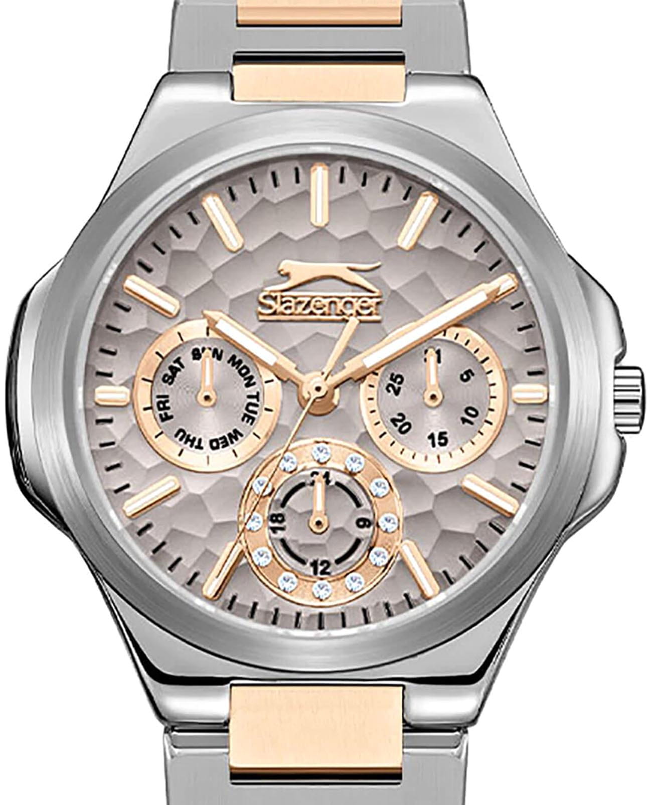 Женские кварцевые часы Slazenger SL.09.2365.4.02 – это сочетание элегантности, современного стиля и надёжности. Изящный корпус из суперметалла серебристого цвета, диаметром 33 мм и толщиной 10 мм, подчёркивает утончённость модели и делает их идеальным аксессуаром для любой ситуации – будь то деловая встреча, романтический вечер или повседневные выходы. Циферблат надёжно защищён минеральным стекломМинеральное стеклоМинеральное стекло представляет собой искусственно выращенный минерал кварца. Такое стекло отличается особой устойчивостью к повреждениям и царапинам. Уступает по некоторым качествам сапфировому стеклу., которое устойчиво к механическим повреждениям и сохраняет кристальную прозрачность. Браслет из суперметалла с частичным IP-покрытиемIP-покрытиеМетод ионного напыления. Демонстрирует повышенную устойчивость к истиранию, окислению и химическим веществам. Под воздействием высокого давления и температуры около 1500°C молекулы металла надёжно соединяются с частицами корпуса часов. цвета розового золота удобно облегает запястье и фиксируется с помощью раскладной застёжкиРаскладная застёжкаТакой тип застёжки используется только на браслетах из металла. Она никогда не раскрывается полностью, происходит разделение на 2 и более частей. Раскладывающая застёжка снизит вероятность потери часов к минимуму., обеспечивая надёжность и комфорт в повседневном ношении. Утончённый стиль, внимание к деталям и практичность делают эту модель идеальным выбором для современных женщин, ценящих эстетику и функциональность. Стрелки и метки покрыты люминесцентным покрытиемЛюминесцентное покрытиеПозволяет считывать показания времени в темноте. Производители наносят на стрелки, часовые индексы, безель или поверхность циферблата светонакопительный состав, дающий холодное свечение., обеспечивающим отличную читаемость в темноте. Вынесенный циферблат с 24-х часовым указателем времени украшен фианитами. Водозащита до 30 метров позволит защитить корпус от случайных брызг или капель дождя.