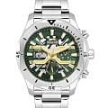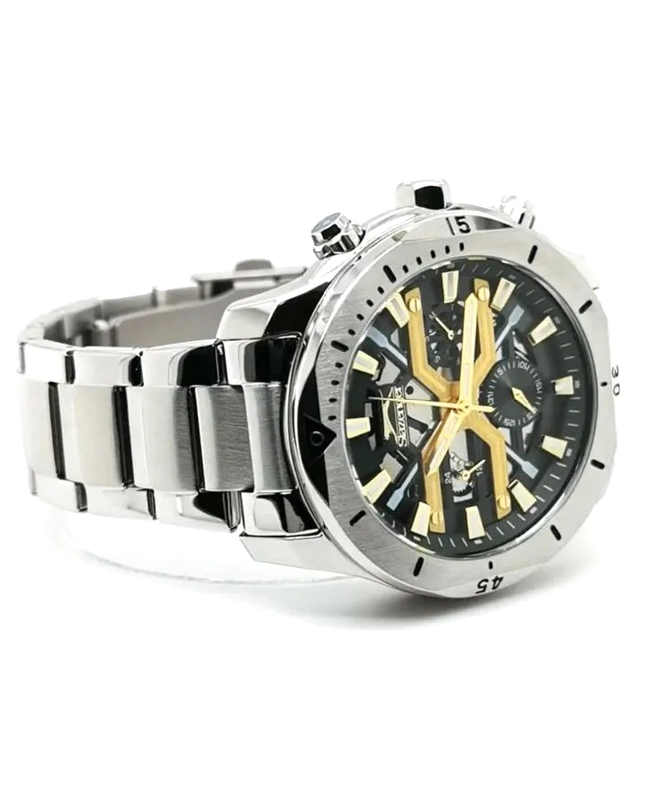 Мужские кварцевые часы Slazenger — это выразительный и функциональный аксессуар. Корпус диаметром 44 мм и толщиной 12 мм выполнен из суперметалла. Циферблат зелёного цвета частично скелетонизирован. Циферблат защищён минеральным стекломМинеральное стеклоМинеральное стекло представляет собой искусственно выращенный минерал кварца. Такое стекло отличается особой устойчивостью к повреждениям и царапинам. Уступает по некоторым качествам сапфировому стеклу.. Механизм — кварцевый калибр VX9JE1. Часы оснащены индикацией дня недели, даты и 12/24-часового формата времени. Часы оснащены браслетом из суперметалла с раскладной застёжкойРаскладная застёжкаТакой тип застёжки используется только на браслетах из металла. Она никогда не раскрывается полностью, происходит разделение на 2 и более частей. Раскладывающая застёжка снизит вероятность потери часов к минимуму.. Водонепроницаемость 50 м позволяет использовать часы в повседневных условиях. Гарантия — 12 месяцев. Идеальный выбор для тех, кто ценит стиль, функциональность и качество.