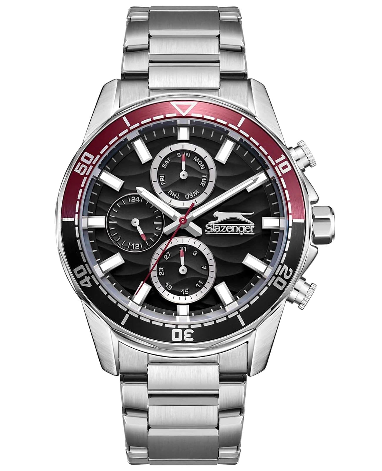 Мужские кварцевые часы Slazenger — это выразительный и функциональный аксессуар. Корпус диаметром 41,5 мм и толщиной 13 мм выполнен из суперметалла. Циферблат чёрного цвета оформлен индексами и стрелками. Циферблат защищён минеральным стекломМинеральное стеклоМинеральное стекло представляет собой искусственно выращенный минерал кварца. Такое стекло отличается особой устойчивостью к повреждениям и царапинам. Уступает по некоторым качествам сапфировому стеклу.. Механизм — кварцевый. Часы оснащены индикацией дня недели, даты и 12/24-часового формата времени. Стрелки и метки с люминесцентным покрытиемЛюминесцентное покрытиеПозволяет считывать показания времени в темноте. Производители наносят на стрелки, часовые индексы, безель или поверхность циферблата светонакопительный состав, дающий холодное свечение., обеспечивающим хорошую читаемость в темноте. Часы оснащены браслетом из суперметалла с раскладной застёжкойРаскладная застёжкаТакой тип застёжки используется только на браслетах из металла. Она никогда не раскрывается полностью, происходит разделение на 2 и более частей. Раскладывающая застёжка снизит вероятность потери часов к минимуму.. Водонепроницаемость 100 м позволяет использовать часы для плавания и повседневного ношения. Гарантия — 12 месяцев. Идеальный выбор для тех, кто ценит стиль, функциональность и качество.
