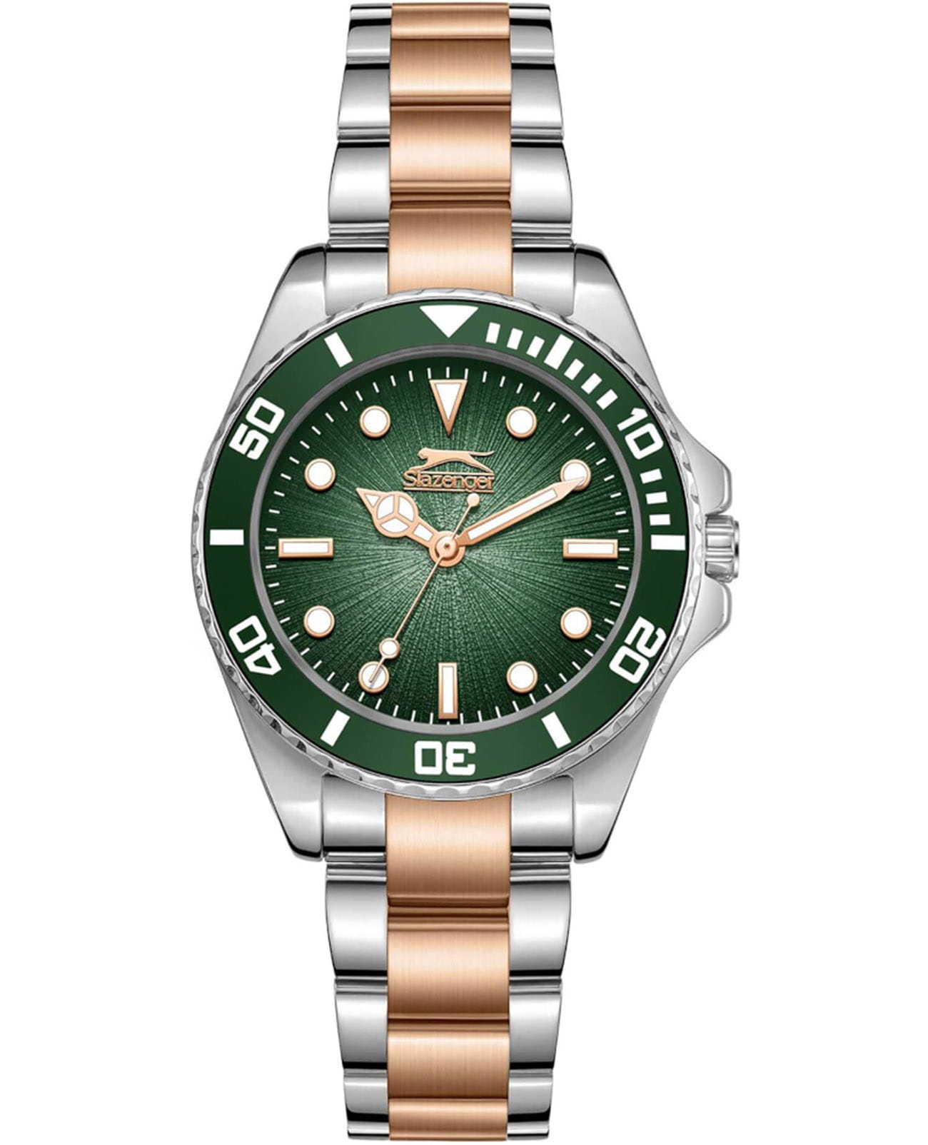 Женские кварцевые часы Slazenger — это элегантный аксессуар. Корпус диаметром 33 мм и толщиной 9 мм выполнен из суперметалла. Безель с IP-покрытиемIP-покрытиеМетод ионного напыления. Демонстрирует повышенную устойчивость к истиранию, окислению и химическим веществам. Под воздействием высокого давления и температуры около 1500°C молекулы металла надёжно соединяются с частицами корпуса часов.. Циферблат зелёного цвета оформлен индексами и стрелками. Циферблат защищён минеральным стекломМинеральное стеклоМинеральное стекло представляет собой искусственно выращенный минерал кварца. Такое стекло отличается особой устойчивостью к повреждениям и царапинам. Уступает по некоторым качествам сапфировому стеклу.. Механизм — кварцевый. Стрелки и метки с люминесцентным покрытиемЛюминесцентное покрытиеПозволяет считывать показания времени в темноте. Производители наносят на стрелки, часовые индексы, безель или поверхность циферблата светонакопительный состав, дающий холодное свечение., обеспечивающим хорошую читаемость в темноте. Часы оснащены браслетом из суперметалла с IP-покрытиемIP-покрытиеМетод ионного напыления. Демонстрирует повышенную устойчивость к истиранию, окислению и химическим веществам. Под воздействием высокого давления и температуры около 1500°C молекулы металла надёжно соединяются с частицами корпуса часов. и раскладной застёжкойРаскладная застёжкаТакой тип застёжки используется только на браслетах из металла. Она никогда не раскрывается полностью, происходит разделение на 2 и более частей. Раскладывающая застёжка снизит вероятность потери часов к минимуму.. Водонепроницаемость 50 м позволяет использовать часы в повседневных условиях. Гарантия — 12 месяцев. Идеальный выбор для тех, кто ценит стиль и качество.