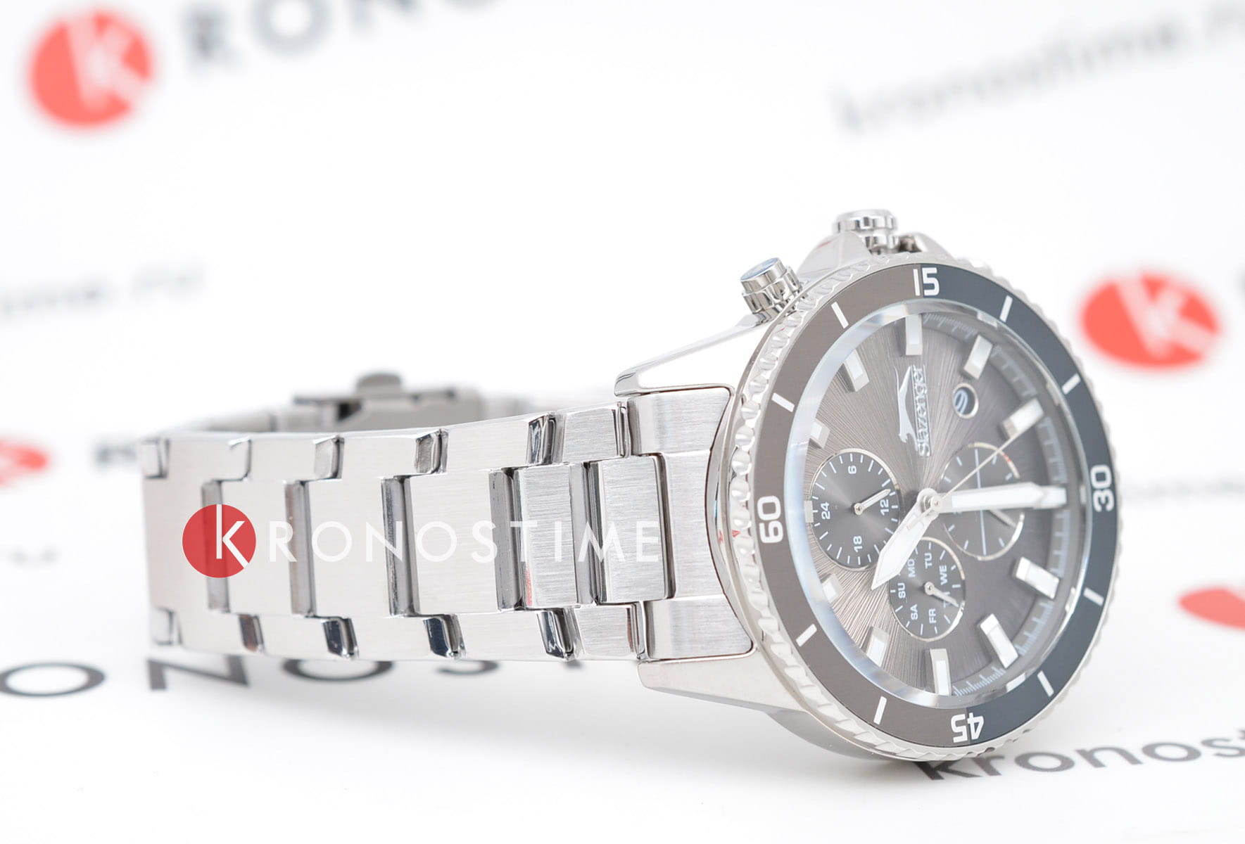 Мужские кварцевые часы Slazenger — это выразительный и функциональный аксессуар. Корпус диаметром 44 мм и толщиной 13 мм выполнен из суперметалла. БезельБезельВнешний ободок, закрепляющий стекло. В спортивных часах так называется поворотное кольцо с делениями на циферблате, выполняет роль таймера – замеряет отрезки времени на шкале. Неподвижный безель – элемент декора. Однонаправленно вращающийся безель на дайверских часах позволяет фиксировать моменты погружения и выныривания на поверхность. из суперметалла с IP-покрытиемIP-покрытиеМетод ионного напыления. Демонстрирует повышенную устойчивость к истиранию, окислению и химическим веществам. Под воздействием высокого давления и температуры около 1500°C молекулы металла надёжно соединяются с частицами корпуса часов.. Циферблат чёрного цвета оформлен индексами и стрелками. Циферблат защищён минеральным стекломМинеральное стеклоМинеральное стекло представляет собой искусственно выращенный минерал кварца. Такое стекло отличается особой устойчивостью к повреждениям и царапинам. Уступает по некоторым качествам сапфировому стеклу.. Механизм — кварцевый калибр. Часы оснащены индикацией дня недели, даты и 12/24-часового формата времени. Окошко даты расположено между 4 и 5 часами. Часы оснащены браслетом из суперметалла с раскладной застёжкойРаскладная застёжкаТакой тип застёжки используется только на браслетах из металла. Она никогда не раскрывается полностью, происходит разделение на 2 и более частей. Раскладывающая застёжка снизит вероятность потери часов к минимуму.. Водонепроницаемость 100 м позволяет использовать часы для плавания и повседневного ношения. Гарантия — 12 месяцев. Идеальный выбор для тех, кто ценит стиль, функциональность и качество.