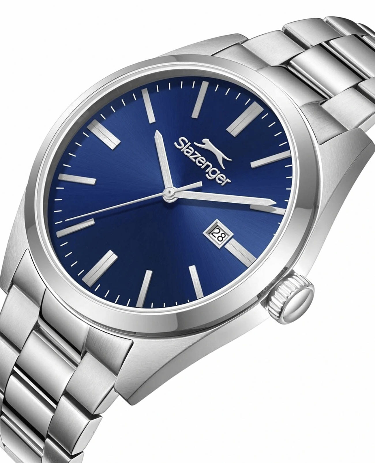 Мужские кварцевые часы Slazenger — это выразительный и функциональный аксессуар. Корпус диаметром 42 мм и толщиной 12 мм выполнен из нержавеющей стали 316L. Циферблат синего цвета оформлен индексами и стрелками. Циферблат защищён минеральным стекломМинеральное стеклоМинеральное стекло представляет собой искусственно выращенный минерал кварца. Такое стекло отличается особой устойчивостью к повреждениям и царапинам. Уступает по некоторым качествам сапфировому стеклу.. Механизм — кварцевый. Окошко даты расположено в положении 3 часов. Часы оснащены стальным браслетом с раскладной застёжкойРаскладная застёжкаТакой тип застёжки используется только на браслетах из металла. Она никогда не раскрывается полностью, происходит разделение на 2 и более частей. Раскладывающая застёжка снизит вероятность потери часов к минимуму.. Водонепроницаемость 100 м позволяет использовать часы для плавания и повседневного ношения. Гарантия — 12 месяцев. Идеальный выбор для тех, кто ценит стиль, функциональность и качество.