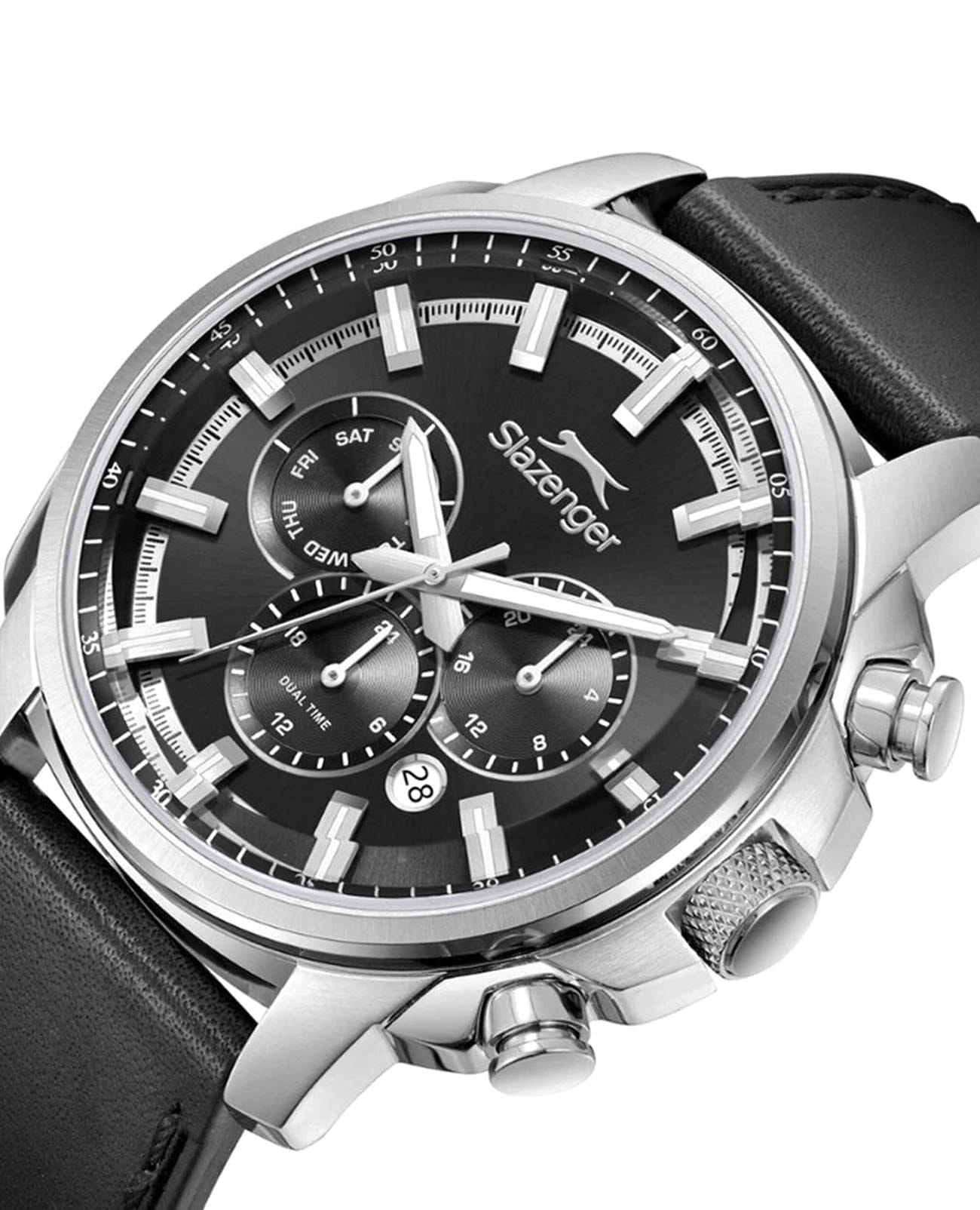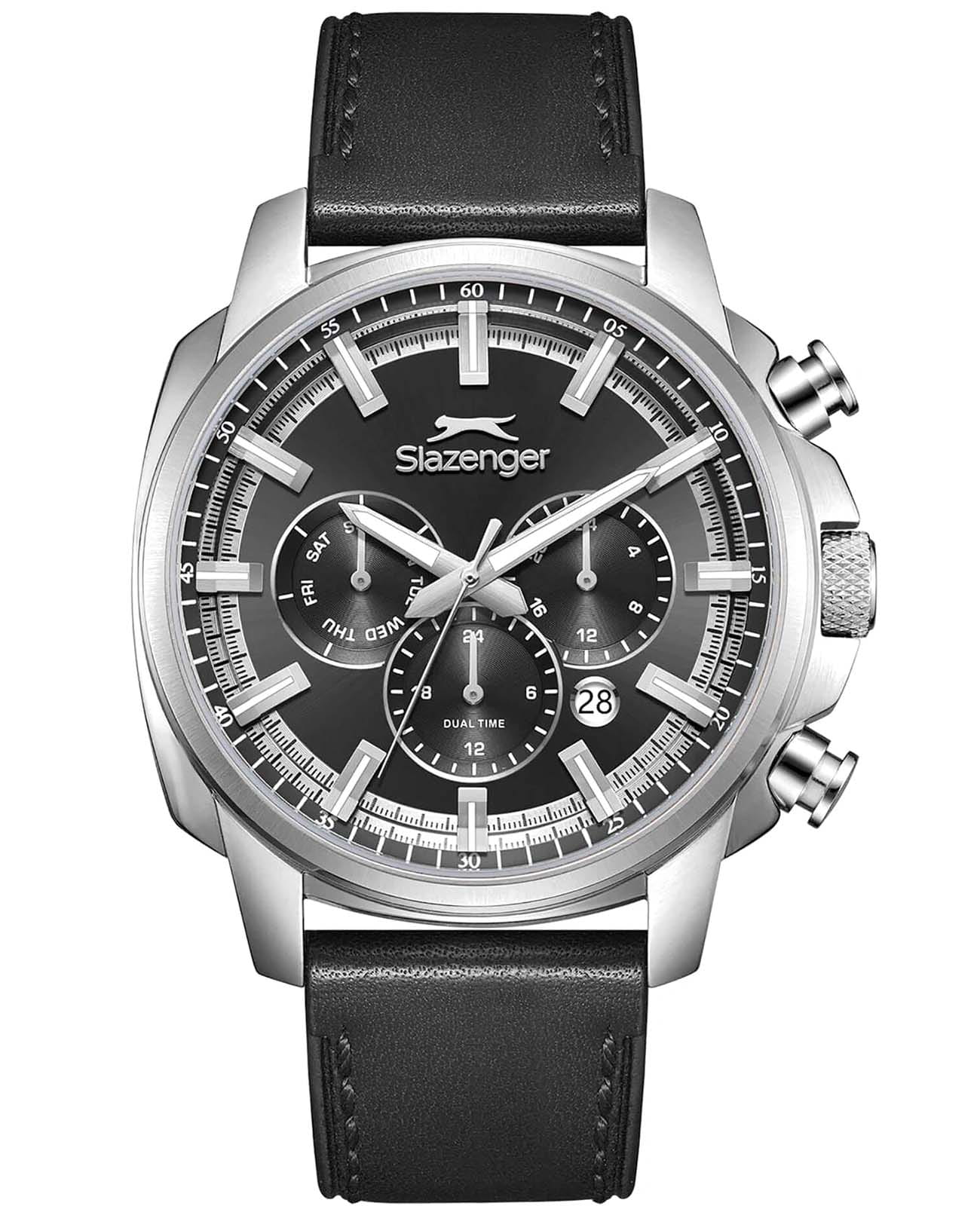 Мужские кварцевые часы Slazenger — это выразительный и функциональный аксессуар. Корпус диаметром 43 мм и толщиной 14 мм выполнен из нержавеющей стали 316L. Циферблат чёрного цвета оформлен индексами и стрелками. Циферблат защищён минеральным стекломМинеральное стеклоМинеральное стекло представляет собой искусственно выращенный минерал кварца. Такое стекло отличается особой устойчивостью к повреждениям и царапинам. Уступает по некоторым качествам сапфировому стеклу.. Механизм — кварцевый. Часы оснащены индикацией дня недели, даты, 12/24-часового формата времени и функцией второго часового пояса (GMT)Второй часовой поясФункция, позволяющая отображать время двух часовых поясов одновременно.. Окошко даты расположено между 4 и 5 часами. Часы оснащены кожаным ремешком со стандартной застёжкой. Водонепроницаемость 100 м позволяет использовать часы для плавания и повседневного ношения. Гарантия — 12 месяцев. Идеальный выбор для тех, кто ценит стиль, функциональность и качество.