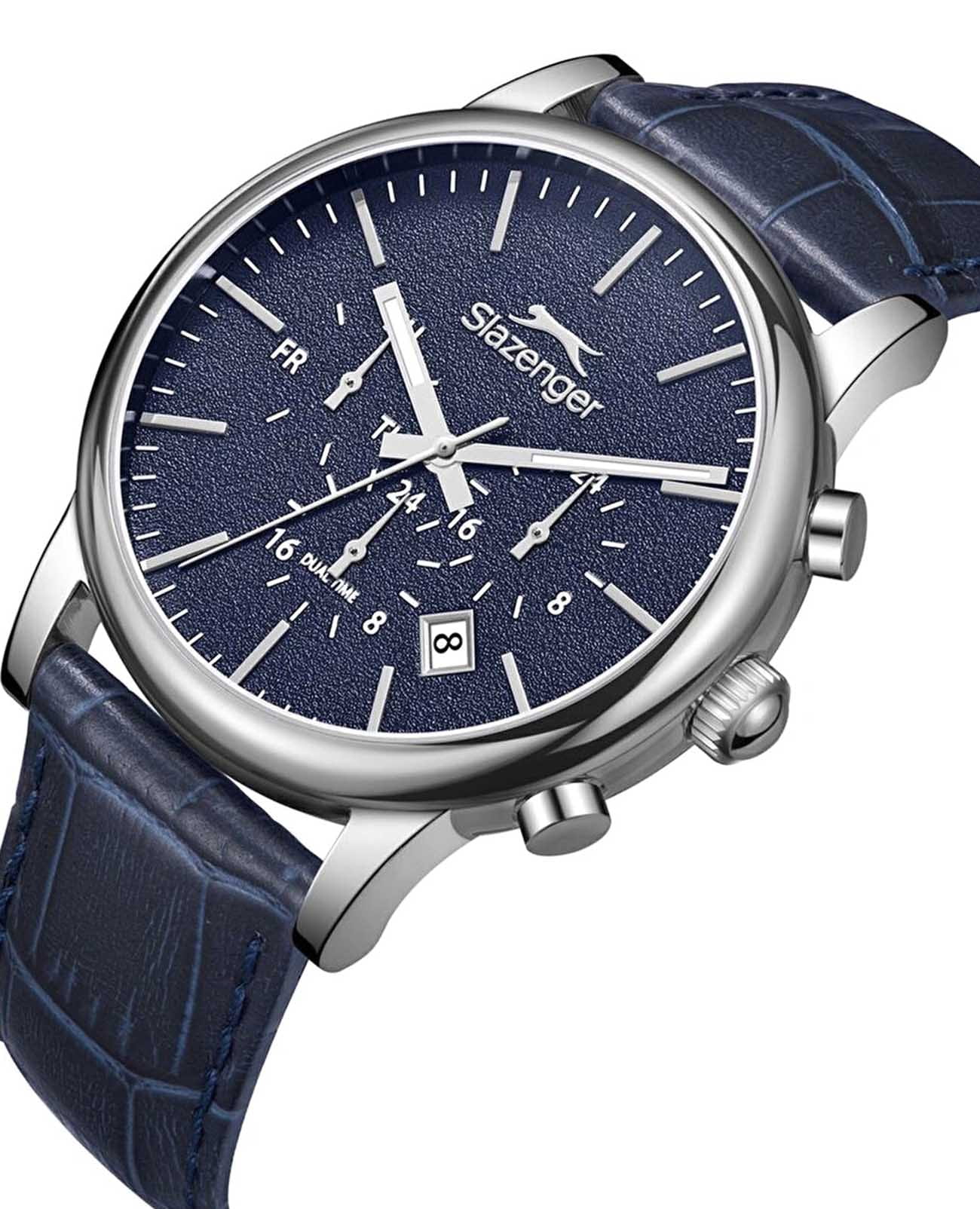 Мужские кварцевые часы Slazenger — это выразительный и функциональный аксессуар. Корпус диаметром 43 мм и толщиной 12 мм выполнен из нержавеющей стали 316L. Циферблат синего цвета оформлен индексами и стрелками. Циферблат защищён минеральным стекломМинеральное стеклоМинеральное стекло представляет собой искусственно выращенный минерал кварца. Такое стекло отличается особой устойчивостью к повреждениям и царапинам. Уступает по некоторым качествам сапфировому стеклу.. Стрелки с люминесцентным покрытиемЛюминесцентное покрытиеПозволяет считывать показания времени в темноте. Производители наносят на стрелки, часовые индексы, безель или поверхность циферблата светонакопительный состав, дающий холодное свечение., обеспечивающим хорошую читаемость в темноте. Механизм — кварцевый. Часы оснащены индикацией дня недели, даты, 12/24-часового формата времени и функцией второго часового пояса (GMT)Второй часовой поясФункция, позволяющая отображать время двух часовых поясов одновременно.. Окошко даты расположено между 4 и 5 часами. Часы оснащены кожаным ремешком с стандартной застёжкой. Водонепроницаемость 100 м позволяет использовать часы для плавания и повседневного ношения. Гарантия — 12 месяцев. Идеальный выбор для тех, кто ценит стиль, функциональность и качество.