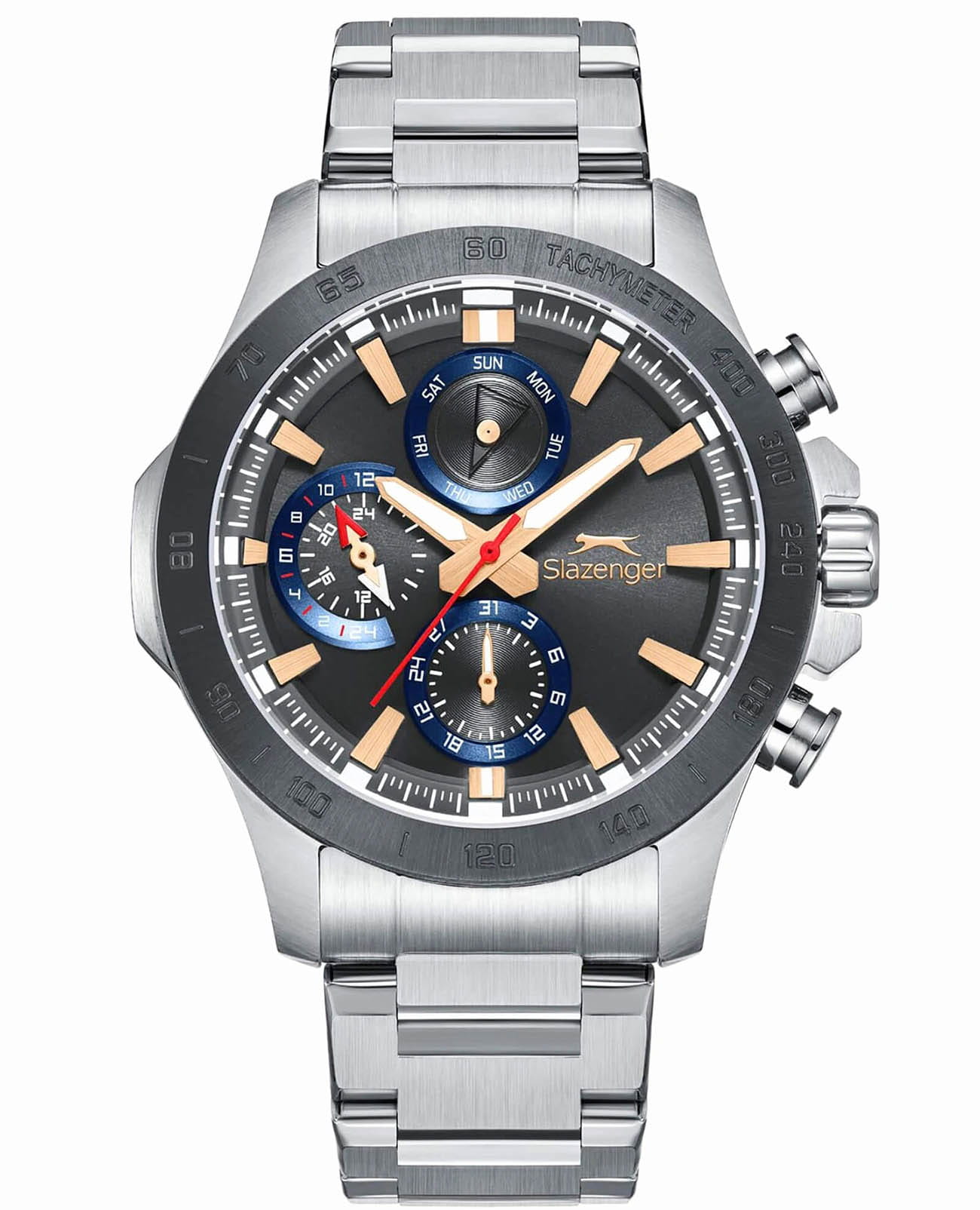 Мужские кварцевые часы Slazenger — это выразительный и функциональный аксессуар. Корпус диаметром 44 мм и толщиной 12 мм выполнен из нержавеющей стали 316L. БезельБезельВнешний ободок, закрепляющий стекло. В спортивных часах так называется поворотное кольцо с делениями на циферблате, выполняет роль таймера – замеряет отрезки времени на шкале. Неподвижный безель – элемент декора. Однонаправленно вращающийся безель на дайверских часах позволяет фиксировать моменты погружения и выныривания на поверхность. с IP-покрытиемIP-покрытиеМетод ионного напыления. Демонстрирует повышенную устойчивость к истиранию, окислению и химическим веществам. Под воздействием высокого давления и температуры около 1500°C молекулы металла надёжно соединяются с частицами корпуса часов.. Циферблат чёрного цвета оформлен индексами и стрелками. Циферблат защищён минеральным стекломМинеральное стеклоМинеральное стекло представляет собой искусственно выращенный минерал кварца. Такое стекло отличается особой устойчивостью к повреждениям и царапинам. Уступает по некоторым качествам сапфировому стеклу.. Механизм — кварцевый. Часы оснащены индикацией дня недели, даты и 12/24-часового формата времени. Стрелки и метки с люминесцентным покрытиемЛюминесцентное покрытиеПозволяет считывать показания времени в темноте. Производители наносят на стрелки, часовые индексы, безель или поверхность циферблата светонакопительный состав, дающий холодное свечение., обеспечивающим хорошую читаемость в темноте. Часы оснащены стальным браслетом с раскладной застёжкойРаскладная застёжкаТакой тип застёжки используется только на браслетах из металла. Она никогда не раскрывается полностью, происходит разделение на 2 и более частей. Раскладывающая застёжка снизит вероятность потери часов к минимуму.. Водонепроницаемость 100 м позволяет использовать часы для плавания и повседневного ношения. Гарантия — 12 месяцев. Идеальный выбор для тех, кто ценит стиль, функциональность и качество.