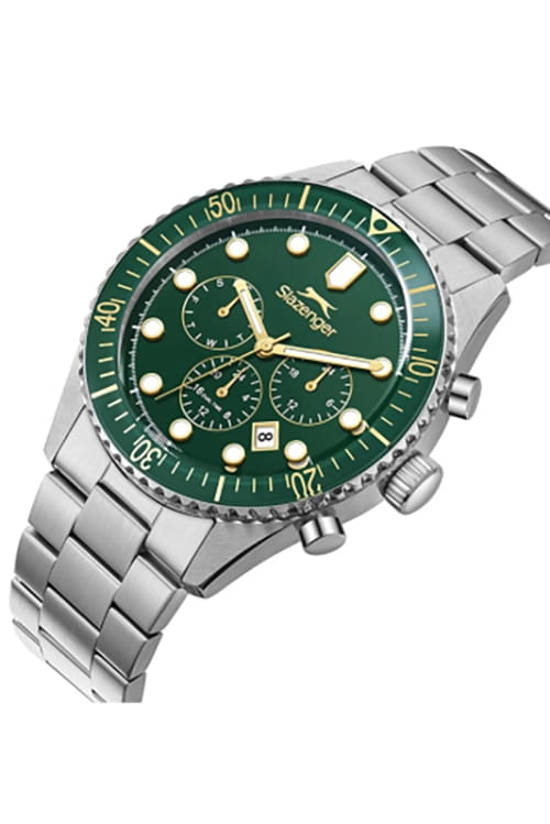 Мужские кварцевые часы Slazenger — это выразительный и функциональный аксессуар. Корпус диаметром 43 мм и толщиной 12 мм выполнен из нержавеющей стали 316L. Циферблат зелёного цвета оформлен индексами и стрелками. Циферблат защищён минеральным стекломМинеральное стеклоМинеральное стекло представляет собой искусственно выращенный минерал кварца. Такое стекло отличается особой устойчивостью к повреждениям и царапинам. Уступает по некоторым качествам сапфировому стеклу.. Механизм — кварцевый. Часы оснащены индикацией дня недели, даты, 12/24-часового формата времени и функцией второго часового пояса (GMT)Второй часовой поясФункция, позволяющая отображать время двух часовых поясов одновременно.. Окошко даты расположено между 4 и 5 часами. Стрелки и метки с люминесцентным покрытиемЛюминесцентное покрытиеПозволяет считывать показания времени в темноте. Производители наносят на стрелки, часовые индексы, безель или поверхность циферблата светонакопительный состав, дающий холодное свечение., обеспечивающим хорошую читаемость в темноте. БезельБезельВнешний ободок, закрепляющий стекло. В спортивных часах так называется поворотное кольцо с делениями на циферблате, выполняет роль таймера – замеряет отрезки времени на шкале. Неподвижный безель – элемент декора. Однонаправленно вращающийся безель на дайверских часах позволяет фиксировать моменты погружения и выныривания на поверхность. с IP-покрытиемIP-покрытиеМетод ионного напыления. Демонстрирует повышенную устойчивость к истиранию, окислению и химическим веществам. Под воздействием высокого давления и температуры около 1500°C молекулы металла надёжно соединяются с частицами корпуса часов.. Часы оснащены стальным браслетом с раскладной застёжкойРаскладная застёжкаТакой тип застёжки используется только на браслетах из металла. Она никогда не раскрывается полностью, происходит разделение на 2 и более частей. Раскладывающая застёжка снизит вероятность потери часов к минимуму.. Водонепроницаемость 100 м позволяет использовать часы для плавания и повседневного ношения. Гарантия — 12 месяцев. Идеальный выбор для тех, кто ценит стиль, функциональность и качество.