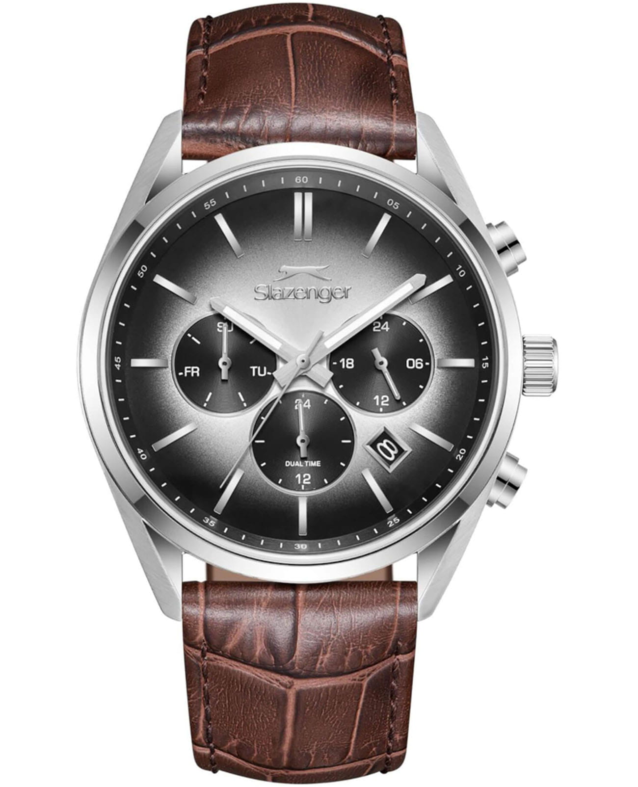 Мужские кварцевые часы Slazenger — это выразительный и функциональный аксессуар. Корпус диаметром 42 мм и толщиной 12 мм выполнен из нержавеющей стали 316L. Циферблат чёрного цвета оформлен индексами и стрелками. Циферблат защищён минеральным стекломМинеральное стеклоМинеральное стекло представляет собой искусственно выращенный минерал кварца. Такое стекло отличается особой устойчивостью к повреждениям и царапинам. Уступает по некоторым качествам сапфировому стеклу.. Механизм — кварцевый. Часы оснащены индикацией дня недели, даты, 12/24-часового формата времени и функцией второго часового пояса (GMT)Второй часовой поясФункция, позволяющая отображать время двух часовых поясов одновременно.. Окошко даты расположено между 4 и 5 часами. Стрелки и метки с люминесцентным покрытиемЛюминесцентное покрытиеПозволяет считывать показания времени в темноте. Производители наносят на стрелки, часовые индексы, безель или поверхность циферблата светонакопительный состав, дающий холодное свечение., обеспечивающим хорошую читаемость в темноте. Часы оснащены кожаным ремешком с стандартной застёжкой. Водонепроницаемость 100 м позволяет использовать часы для плавания и повседневного ношения. Гарантия — 12 месяцев. Идеальный выбор для тех, кто ценит стиль, функциональность и качество.