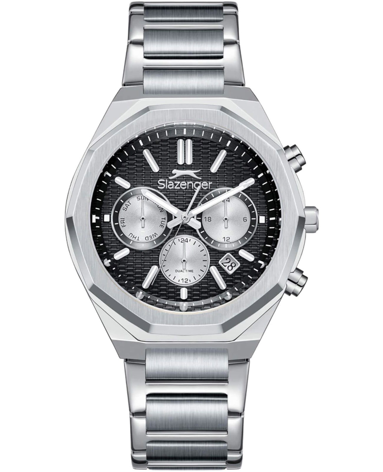 Мужские кварцевые часы Slazenger — это выразительный и функциональный аксессуар. Корпус диаметром 42 мм и толщиной 12,5 мм выполнен из нержавеющей стали 316L. Циферблат чёрного цвета оформлен индексами и стрелками. Окошко даты расположено между 4 и 5 часами. Указатель дня недели и 24-часовой формат времени вынесены на отдельные субциферблаты. Циферблат защищён минеральным стекломМинеральное стеклоМинеральное стекло представляет собой искусственно выращенный минерал кварца. Такое стекло отличается особой устойчивостью к повреждениям и царапинам. Уступает по некоторым качествам сапфировому стеклу.. Механизм — кварцевый калибр JP25. Часы оснащены функцией второго часового пояса (GMT)Второй часовой поясФункция, позволяющая отображать время двух часовых поясов одновременно.. Стрелки и метки с люминесцентным покрытиемЛюминесцентное покрытиеПозволяет считывать показания времени в темноте. Производители наносят на стрелки, часовые индексы, безель или поверхность циферблата светонакопительный состав, дающий холодное свечение., обеспечивающим хорошую читаемость в темноте. Часы оснащены стальным браслетом с раскладной застёжкойРаскладная застёжкаТакой тип застёжки используется только на браслетах из металла. Она никогда не раскрывается полностью, происходит разделение на 2 и более частей. Раскладывающая застёжка снизит вероятность потери часов к минимуму.. Водонепроницаемость 100 м позволяет использовать часы для плавания и повседневного ношения. Гарантия — 12 месяцев. Идеальный выбор для тех, кто ценит стиль, функциональность и качество.