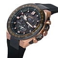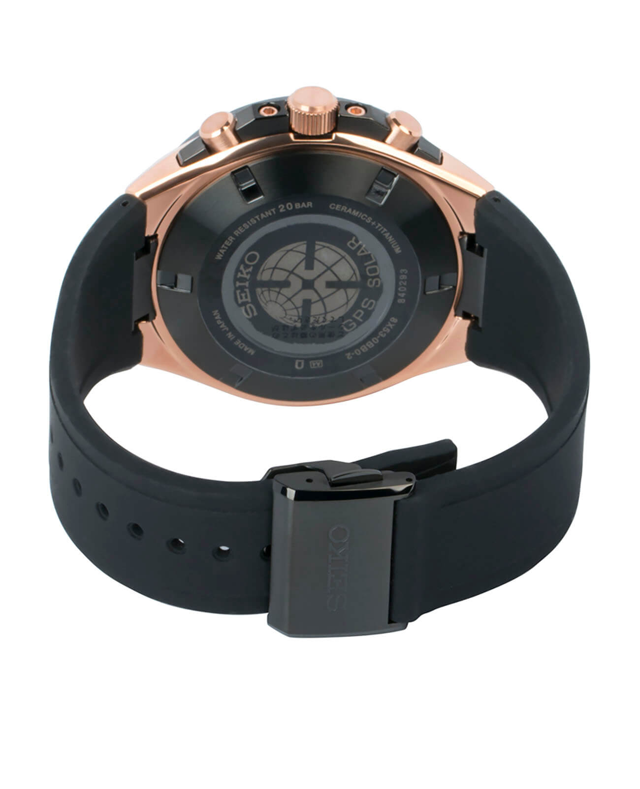 -сигнала. Он определяет точное время, дату, часовой пояс по данным со спутника. Кварцевый японский механизм Seiko 8X53 получает питание от солнечной батареи . Стекло из сапфира. Титановый корпус с PVD-покрытиемPVDУльтратонкое покрытие наносится в технике вакуумного напыления, сочетает в себе нитрид титана особой прочности со слоем золота или оксида хрома. Несёт в себе декоративную или защитную функцию.. Вращающийся безельБезельВнешний ободок, закрепляющий стекло. В спортивных часах так называется поворотное кольцо с делениями на циферблате, выполняет роль таймера – замеряет отрезки времени на шкале. Неподвижный безель – элемент декора. Однонаправленно вращающийся безель на дайверских часах позволяет фиксировать моменты погружения и выныривания на поверхность. из керамики. Водостойкость 200 метров. Заводная головка с системой защиты. Силиконовый ремешок. Вечный календарьВечный календарьКлассическое часовое усложнение, представляющее собой календарь, рассчитанный на несколько лет вперёд (стандартно – до 2099 года). Определяет текущую дату, день недели, месяц.. Стрелки и метки с люминесцентнымЛюминесцентное покрытиеПозволяет считывать показания времени в темноте. Производители наносят на стрелки, часовые индексы, безель или поверхность циферблата светонакопительный состав, дающий холодное свечение. покрытием. Диаметр корпуса: 46,7 мм.