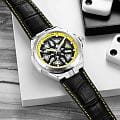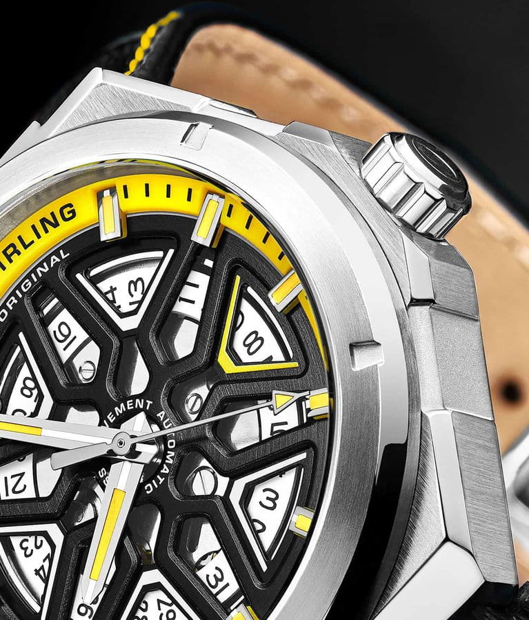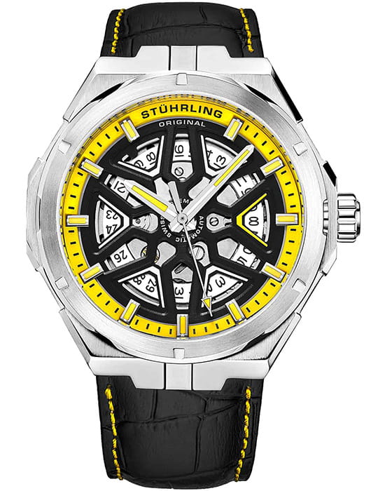 Stuhrling 379.03 — футуристические мужские часы, сочетающие смелый инженерный дизайн и надёжную механику. Архитектурный циферблат с многослойной структурой придаёт модели динамику и глубину. Стрелки и метки с люминесцентным покрытиемЛюминесцентное покрытиеПозволяет считывать показания времени в темноте. Производители наносят на стрелки, часовые индексы, безель или поверхность циферблата светонакопительный состав, дающий холодное свечение.. Корпус из нержавеющей стали выполнен с филигранной обработкой граней, подчёркивая технический характер часов. Прочное стекло KrysternaKrysternaKrysterna — инновационное стекло для наручных часов. Благодаря уникальной структуре, Krysterna объединяет ключевые преимущества двух материалов: твердость сапфира, защищающую от царапин, и гибкость минерального стекла, обеспечивающую устойчивость к деформациям. Такая комбинация делает его идеальным решением для часов, подверженных экстремальным нагрузкам, сохраняя при этом оптическую прозрачность. защищает сложную конструкцию от повреждений, сохраняя идеальную прозрачность. Кожаный ремень с контрастной строчкой и стандартной застежкой, обеспечивает комфорт и надёжную посадку. Stuhrling — выбор для тех, кто ценит оригинальность и технологичный стиль, где каждая деталь работает на впечатление.