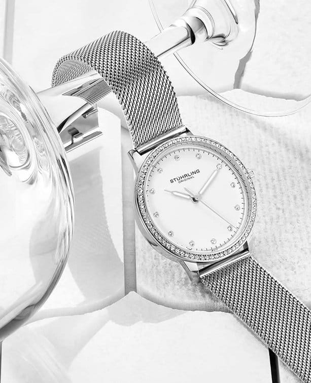 Женские наручные часы Stührling Original 3904.1 из коллекции Vogue — это элегантная модель, сочетающая классический дизайн и современные технологии . Часы относятся к категории dress watch (деловые часы), что делает их идеальным выбором для повседневного использования или особых случаев. Корпус часов диаметром 38 мм изготовлен из высококачественной нержавеющей стали, что обеспечивает надежность и устойчивость к внешним воздействиям . Толщина корпуса составляет всего 8,25 мм, что делает модель изящной и комфортной для ношения . Защиту циферблата обеспечивает прочное стекло KrysternaKrysternaKrysterna — инновационное стекло для наручных часов. Благодаря уникальной структуре, Krysterna объединяет ключевые преимущества двух материалов: твердость сапфира, защищающую от царапин, и гибкость минерального стекла, обеспечивающую устойчивость к деформациям. Такая комбинация делает его идеальным решением для часов, подверженных экстремальным нагрузкам, сохраняя при этом оптическую прозрачность., известное своей устойчивостью к царапинам и механическим повреждениям. Часы оснащены кварцевым механизмом, обеспечивающим точность хода без необходимости ручного завода. Браслет миланского плетения из того же матеариала на раскладном замкеРаскладной замокДанный вариант застежки используется только на часах с металлическим браслетом. Отличительная особенность такого крепления в том, что длина браслета становится универсальной и вы можете самостоятельно отрегулировать нужный вам размер – застежка просто двигается по браслету часов.. Эта модель станет стильным аксессуаром для женщин, ценящих элегантность и практичность в повседневной жизни .