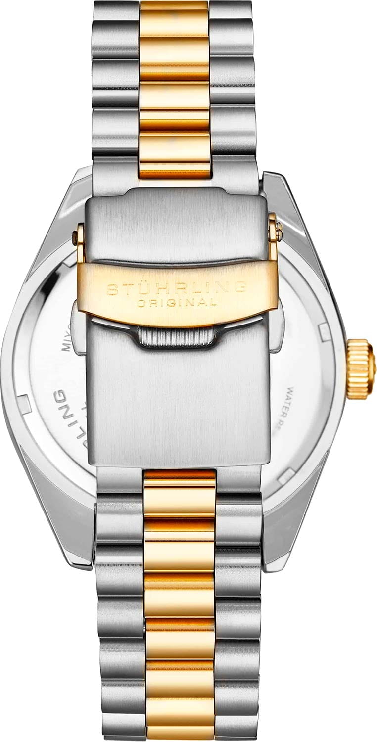 Stuhrling 3935.6 — элегантные мужские часы, объединяющие строгую классику и современную функциональность. Корпус из нержавеющей стали создают ощущение монолитной надёжности, а глубокий циферблат придаёт модели выразительность и характер. БезельБезельВнешний ободок, закрепляющий стекло. В спортивных часах так называется поворотное кольцо с делениями на циферблате, выполняет роль таймера – замеряет отрезки времени на шкале. Неподвижный безель – элемент декора. Однонаправленно вращающийся безель на дайверских часах позволяет фиксировать моменты погружения и выныривания на поверхность. с PVD-покрытиемPVDУльтратонкое покрытие наносится в технике вакуумного напыления, сочетает в себе нитрид титана особой прочности со слоем золота или оксида хрома. Несёт в себе декоративную или защитную функцию.. Стальной браслет с PVD-покрытиемPVDУльтратонкое покрытие наносится в технике вакуумного напыления, сочетает в себе нитрид титана особой прочности со слоем золота или оксида хрома. Несёт в себе декоративную или защитную функцию. на раскладной застёжкеРаскладная застёжкаТакой тип застёжки используется только на браслетах из металла. Она никогда не раскрывается полностью, происходит разделение на 2 и более частей. Раскладывающая застёжка снизит вероятность потери часов к минимуму. обеспечивает комфорт. Крупные метки и стрелки с люминесцентным покрытиемЛюминесцентное покрытиеПозволяет считывать показания времени в темноте. Производители наносят на стрелки, часовые индексы, безель или поверхность циферблата светонакопительный состав, дающий холодное свечение. обеспечивают идеальную читаемость даже в темноте. На позиции «3 часов» расположено аккуратное окно даты, подчёркивающее симметрию дизайна. Прочное стекло Krysterna защищает циферблат от царапин, а надёжный кварцевый механизм гарантирует стабильную точность. Stuhrling — выбор уверенного мужчины, ценящего сочетание функциональности, лаконичного дизайна и безупречной отделки.