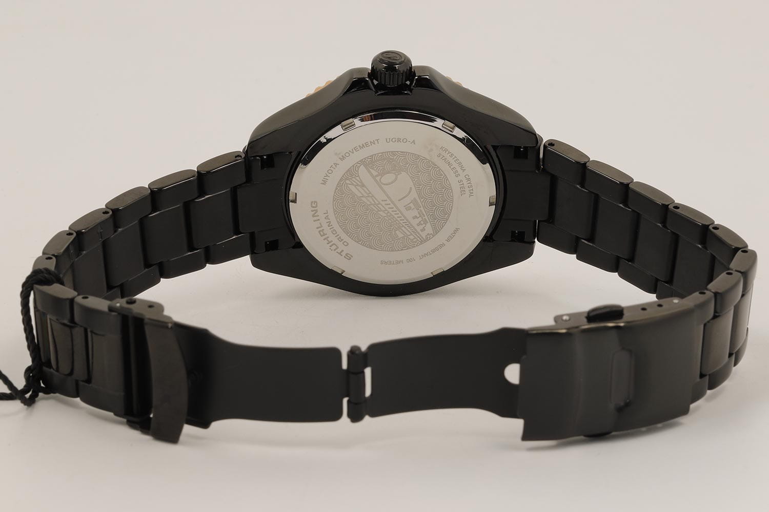 Stuhrling 3950A.9 — стильные мужские часы в духе морского дайверского дизайна. Глубокий циферблат с радиальным переливом и крупные метки/стрелки с люминесцентным покрытиемЛюминесцентное покрытиеПозволяет считывать показания времени в темноте. Производители наносят на стрелки, часовые индексы, безель или поверхность циферблата светонакопительный состав, дающий холодное свечение. обеспечивают отличную читаемость, вращающийся безельБезельВнешний ободок, закрепляющий стекло. В спортивных часах так называется поворотное кольцо с делениями на циферблате, выполняет роль таймера – замеряет отрезки времени на шкале. Неподвижный безель – элемент декора. Однонаправленно вращающийся безель на дайверских часах позволяет фиксировать моменты погружения и выныривания на поверхность. с PVD-покрытиемPVDУльтратонкое покрытие наносится в технике вакуумного напыления, сочетает в себе нитрид титана особой прочности со слоем золота или оксида хрома. Несёт в себе декоративную или защитную функцию. подчёркивает спортивный характер. Корпус и браслет с PVD-покрытиемPVDУльтратонкое покрытие наносится в технике вакуумного напыления, сочетает в себе нитрид титана особой прочности со слоем золота или оксида хрома. Несёт в себе декоративную или защитную функцию. из нержавеющей стали, удобная раскладная застёжкаРаскладная застёжкаТакой тип застёжки используется только на браслетах из металла. Она никогда не раскрывается полностью, происходит разделение на 2 и более частей. Раскладывающая застёжка снизит вероятность потери часов к минимуму. фиксирует часы на запястье. Циферблат прикрыт стеклом Krysterna с высокой стойкостью к царапинам. Надёжный спутник для повседневной настроения и активного отдыха.