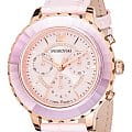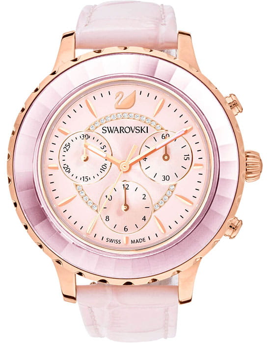 Женские часы Swarovski Octea Lux Chrono 5452501 – это роскошные часы с секундомеромСекундомерСекундоме́р — прибор, способный измерять интервалы времени с точностью до долей секунды. и хронографомХронографФункция позволяет измерять отрезки времени с особой точностью: часы, минуты, секунды. Верным признаком хронографа является наличие на циферблате 3 дополнительных окошек-счётчиков., поистине, образец точности и роскоши, ведь они сочетают в себе лучшие традиции швейцарского часового искусства и неповторимое мастерство Swarovski. Прекрасный аксессуар, подходящий к любому повседневному образу. Часы имеют функцию хронографаХронографФункция позволяет измерять отрезки времени с особой точностью: часы, минуты, секунды. Верным признаком хронографа является наличие на циферблате 3 дополнительных окошек-счётчиков., позволяющую запустить отсчет, остановить его и обнулить результаты. Корпус из нержавеющей стали с PVDPVDУльтратонкое покрытие наносится в технике вакуумного напыления, сочетает в себе нитрид титана особой прочности со слоем золота или оксида хрома. Несёт в себе декоративную или защитную функцию. покрытием оттенка розового золота гармонично сочетается с огранённым кристальным безелемБезельВнешний ободок, закрепляющий стекло. В спортивных часах так называется поворотное кольцо с делениями на циферблате, выполняет роль таймера – замеряет отрезки времени на шкале. Неподвижный безель – элемент декора. Однонаправленно вращающийся безель на дайверских часах позволяет фиксировать моменты погружения и выныривания на поверхность., который встречается только в коллекции часов Swarovski. Его светло-розовое сияние удачно сочетается с розовым циферблатом с рисунком в виде солнечных лучей и ремешком из натуральной кожи с тиснением под крокодила. Надежное минеральное стеклоМинеральное стеклоМинеральное стекло представляет собой искусственно выращенный минерал кварца. Такое стекло отличается особой устойчивостью к повреждениям и царапинам. Уступает по некоторым качествам сапфировому стеклу. защищает часы от царапин и долго сохраняет первоначальный внешний вид. На часовую, минутную стрелки нанесено люминесцентное покрытиеЛюминесцентное покрытиеПозволяет считывать показания времени в темноте. Производители наносят на стрелки, часовые индексы, безель или поверхность циферблата светонакопительный состав, дающий холодное свечение., которое светится в темноте, создавая необычное изображение.