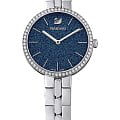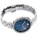 Синий циферблат с изящными серебристыми метками и стрелками подчёркивает элегантность часов. На отметке «12 часов» расположен логотип Swarovski в виде лебедя.