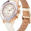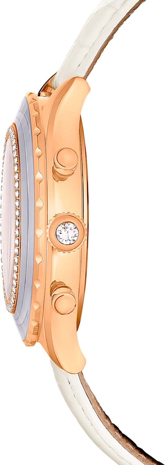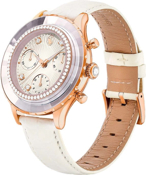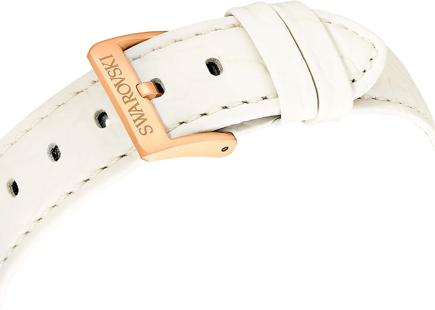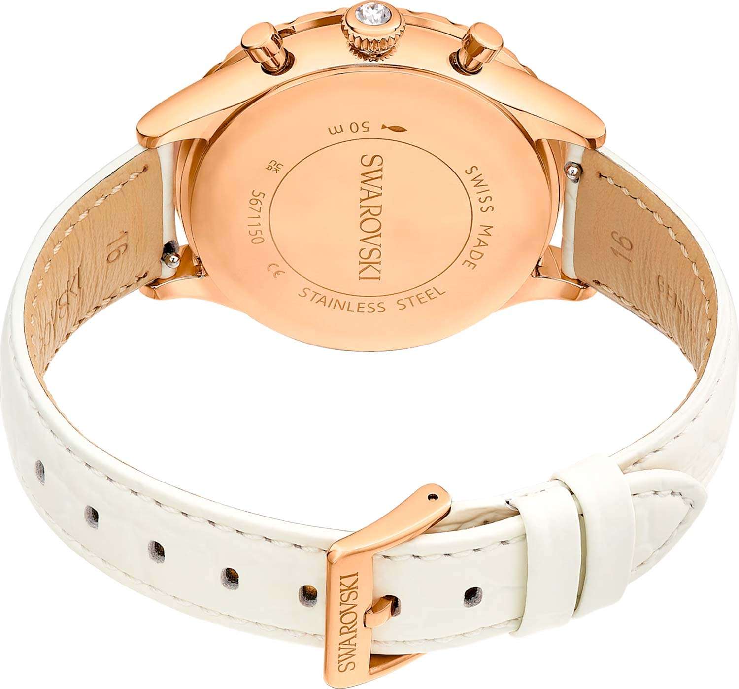 Часы Swarovski 5671150 представляют собой изысканное сочетание стиля и функциональности, идеально подходящее для ценителей элегантных аксессуаров. Эти швейцарские кварцевые часы с хронографомХронографФункция позволяет измерять отрезки времени с особой точностью: часы, минуты, секунды. Верным признаком хронографа является наличие на циферблате 3 дополнительных окошек-счётчиков. и  секундомеромСекундомерСекундоме́р — прибор, способный измерять интервалы времени с точностью до долей секунды. заключены в корпус из стали с розовым PVDPVDУльтратонкое покрытие наносится в технике вакуумного напыления, сочетает в себе нитрид титана особой прочности со слоем золота или оксида хрома. Несёт в себе декоративную или защитную функцию. покрытием, который дополнен белым циферблатом. Особое внимание привлекает инкрустация кристаллами Swarovski, украшающими корпус и циферблат, создавая эффектный блеск и подчеркивая роскошь изделия. Минеральное стеклоМинеральное стеклоМинеральное стекло представляет собой искусственно выращенный минерал кварца. Такое стекло отличается особой устойчивостью к повреждениям и царапинам. Уступает по некоторым качествам сапфировому стеклу. надежно защищает циферблат, а водозащита 50 WR позволяет не беспокоиться о контакте с водой в повседневных ситуациях. Эти часы не только точные и надежные, благодаря кварцевому механизму, но и невероятно стильные, благодаря кристальному безелюБезельВнешний ободок, закрепляющий стекло. В спортивных часах так называется поворотное кольцо с делениями на циферблате, выполняет роль таймера – замеряет отрезки времени на шкале. Неподвижный безель – элемент декора. Однонаправленно вращающийся безель на дайверских часах позволяет фиксировать моменты погружения и выныривания на поверхность. и белому ремешку из натуральной итальянской телячьей кожи с тиснением под крокодила, что обеспечивает комфортное ношение и стильный внешний вид. Заводная головка дополнительно украшена кристаллом круглой огранки, придающим часам завершенность и изящество. Люминесцентное покрытиеЛюминесцентное покрытиеПозволяет считывать показания времени в темноте. Производители наносят на стрелки, часовые индексы, безель или поверхность циферблата светонакопительный состав, дающий холодное свечение. на стрелках обеспечивает отличную видимость в темноте. Эти часы не просто аксессуар, а настоящее произведение искусства, способное стать ярким акцентом любого образа.