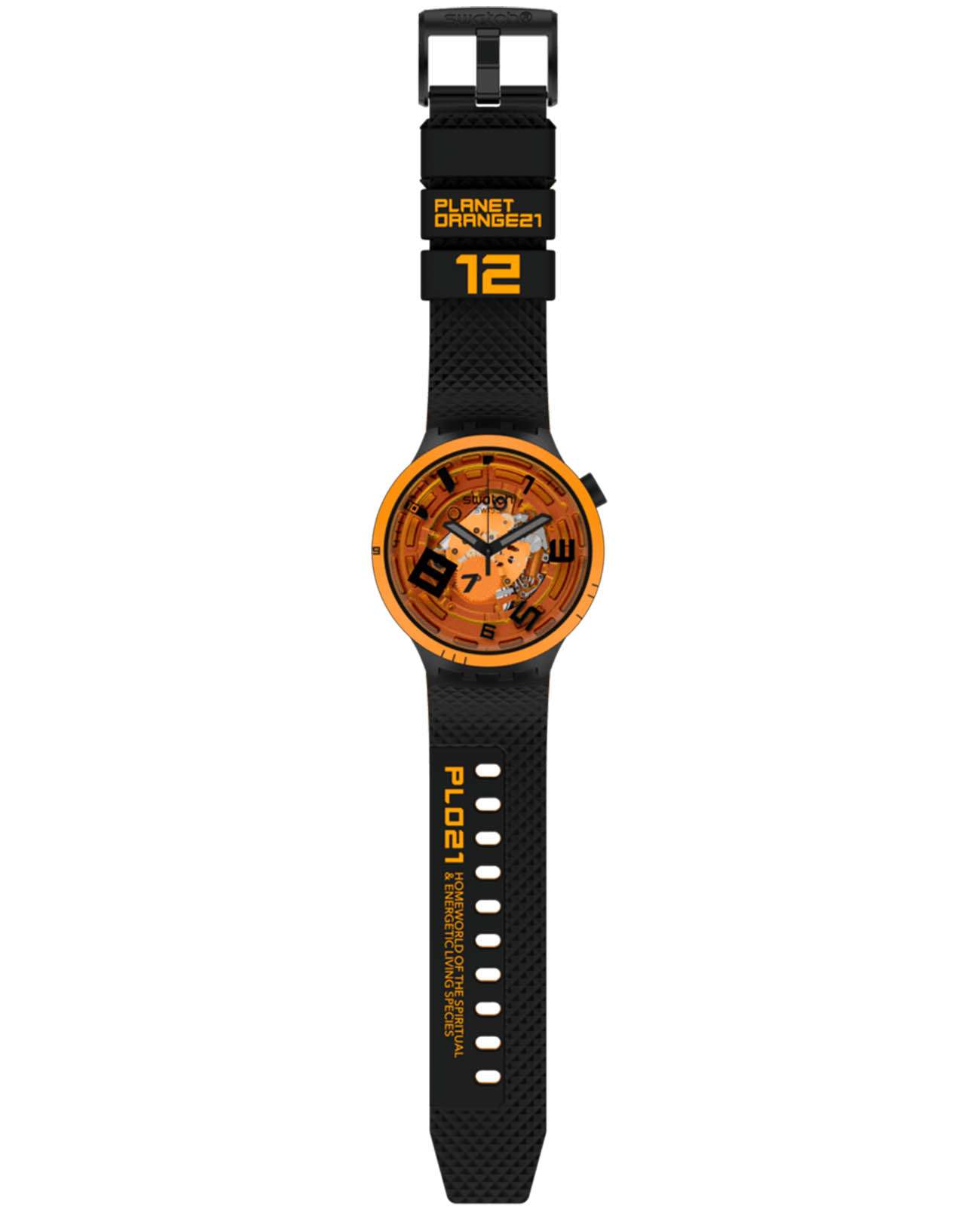 Часы Swatch SB01B127 — это стильный и современный аксессуар для тех, кто ценит лёгкость и комфорт. Часы идеально подойдут как для мужчин, так и для женщин. Модель идет в комплекте с двумя ремешками: матовый силиконовый ремешок в смелом сочетании черного и оранжевого цвета, а второй —  в специальной упаковке предназначен для дальнейшей смены образа. Прозрачный циферблат с разноцветным принтом позволяет сделать акцент на светящихся в темноте стрелках. Особым элементов этих часов является цифра семь, размещенная на декоративном колесике механизма. На часовую, минутную стрелки нанесено люминесцентное покрытиеЛюминесцентное покрытиеПозволяет считывать показания времени в темноте. Производители наносят на стрелки, часовые индексы, безель или поверхность циферблата светонакопительный состав, дающий холодное свечение., которое светится в темноте, создавая необычное изображение. Водозащита 30 метров делает часы практичными для повседневного использования. Эти часы подойдут для повседневного ношения и станут ярким акцентом в вашем наряде.