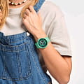 Часы Swatch SB01G101 — это стильный и современный аксессуар для тех, кто ценит лёгкость и комфорт. Часы идеально подойдут как для мужчин, так и для женщин. Корпус этих крупных часов выполнен из прочного матового пластика зеленого цвета, а ремешок — из силикона. На часовую, минутную стрелки нанесено люминесцентное покрытиеЛюминесцентное покрытиеПозволяет считывать показания времени в темноте. Производители наносят на стрелки, часовые индексы, безель или поверхность циферблата светонакопительный состав, дающий холодное свечение., которое светится в темноте, создавая необычное изображение. Водозащита 30 метров делает часы практичными для повседневного использования. Эти часы подойдут для повседневного ношения и станут ярким акцентом в вашем наряде.