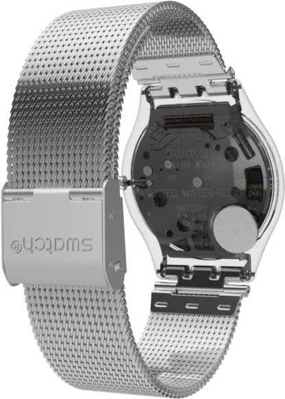 Швейцарские наручные часы Swatch SFM118M. Эти современные и легкие женские часы относятся к коллекции Skin, изготовлены из сверхтонкого и точного кварца швейцарского производства. Ультратонкие, толщина 3.9 мм, диаметр корпуса 34 мм. С водозащитой до 30 метров они надежно защищают корпус от случайных брызг и капель дождя. Многослойное акриловое стекло, используемое в этих часах, обладает высокой прочностью и трудно разбивается; это легкий прозрачный пластик, который может прогибаться при ударах и не разлетается на осколки. Кроме того, акрил устойчив к перепадам температуры и высокому давлению. Корпус часов выполнен из полимера, а механизм — кварцевый. Кварцевые часы обеспечивают большую точность по сравнению с механическими, с погрешностью хода около 20 секунд в месяц. Они не требуют завода, достаточно менять батарейку раз в несколько лет. Стальной браслет миланского плетения на застежке "раскладной замок", позволяющей легко регулировать браслет по длине.