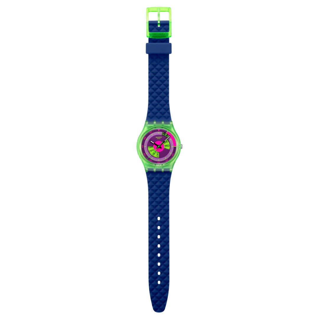 Женские наручные часы SWATCH NEON SKYCHART SO28G704 — это стильный и современный аксессуар для тех, кто ценит лёгкость и комфорт. Эти ретро-часы созданы по мотивам часов Swatch GENT 90-х годов: коллекционной модели SKYCHART (GN705). Корпус выполнен из пластика диаметром 34 мм и толщиной 8.75 мм, что обеспечивает долговечность и утончённый внешний вид. Циферблат защищён органическим стеклом, устойчивым к повреждениям. Модель оснащена кварцевым механизмом, обеспечивающим высокую точность хода. Черные часовая и минутная стрелки с люминесцентным покрытиемЛюминесцентное покрытиеПозволяет считывать показания времени в темноте. Производители наносят на стрелки, часовые индексы, безель или поверхность циферблата светонакопительный состав, дающий холодное свечение.. На разноцветном циферблате есть специальные окошки дней недели в положении "3 часа" и "9 часов", а также окошко даты в положении "1 час". Силиконовый ремешок на стандартной застёжке гармонично дополняет корпус и обеспечивает комфортное ношение. Водозащита 30 метров делает часы практичными для повседневного использования. Эти часы подойдут для повседневного ношения и станут ярким акцентом в вашем наряде.