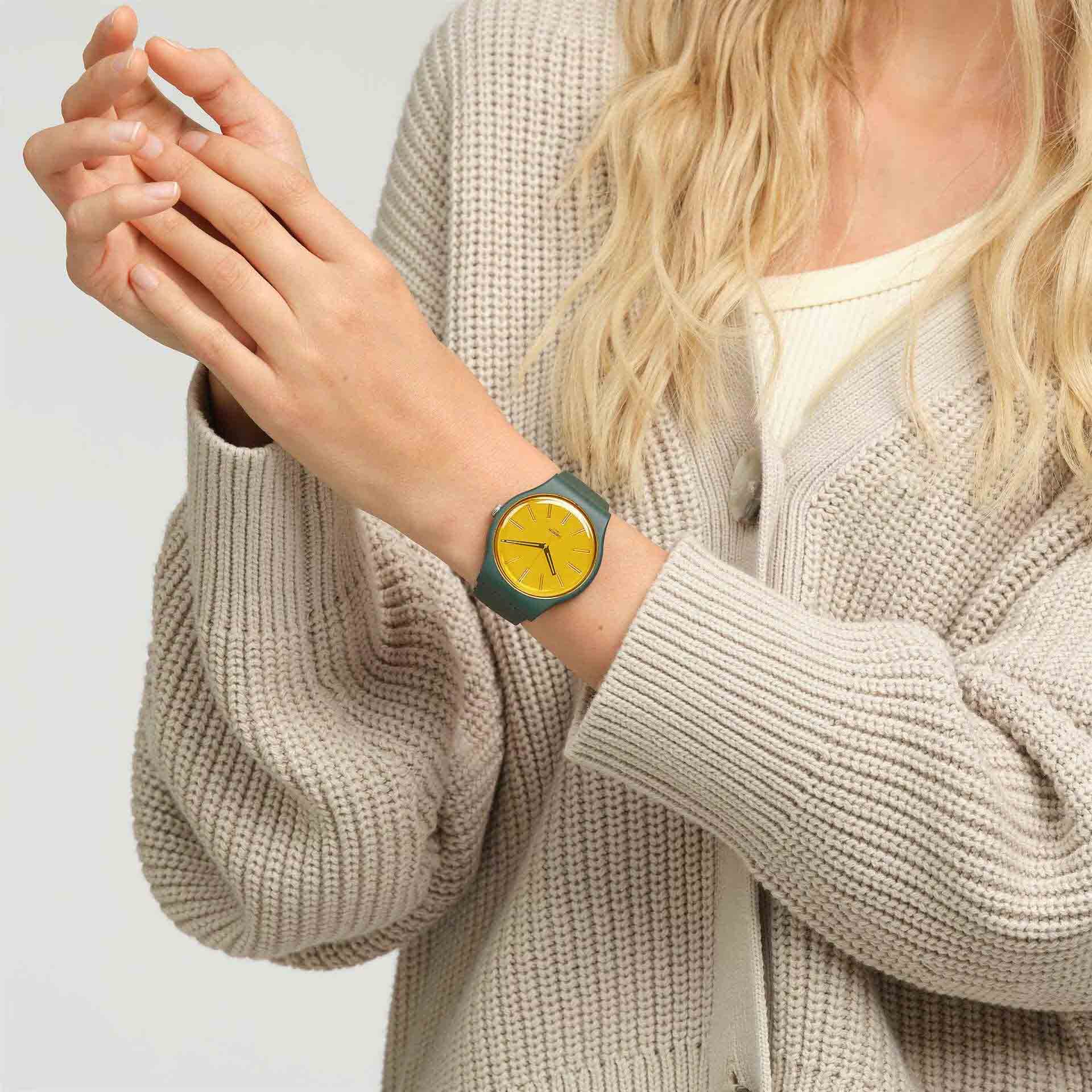 Часы Swatch SO29G103 — стильный и надежный аксессуар. Современный взгляд на классику. Эти часы имеют зеленый корпус и ремешок из биоматериала, черные стрелки и желтый циферблат, покрытый прозрачным желтым биостеклом. Мерцающий блеск модели обусловлен особым методом гравированной отделки. Внутри часов установлен надежный кварцевый механизм, который обеспечивает точность хода. Эти часы водонепроницаемы до 30 метров, что позволяет не беспокоиться о случайных брызгах или дождевых каплях. Swatch SO29G103 — это идеальный выбор для тех, кто ценит сочетание стиля, комфорта и функциональности в одном аксессуаре.
